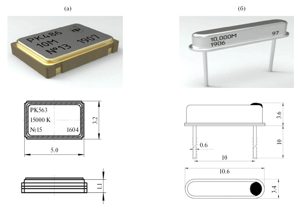 Рис. 1. Общий вид и габаритные размеры резонаторов (а) — РК563 (тип 1) в корпусе поверхностного монтажа и (б) — РК319 (тип 2) в корпусе четвертьволнового резонатора.