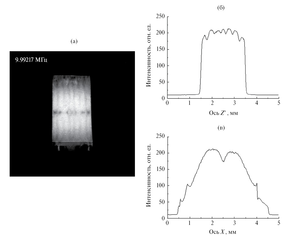Для резонатора с номинальной частотой 10 МГц были записаны топограммы на частоте ангармонического колебания 10.43383 МГц (рис. 6). Графики распределения амплитуды колебаний свидетельствуют о наличии интерференции волн, возникающих вдоль осей X и Zʹ кристаллической пластины.
