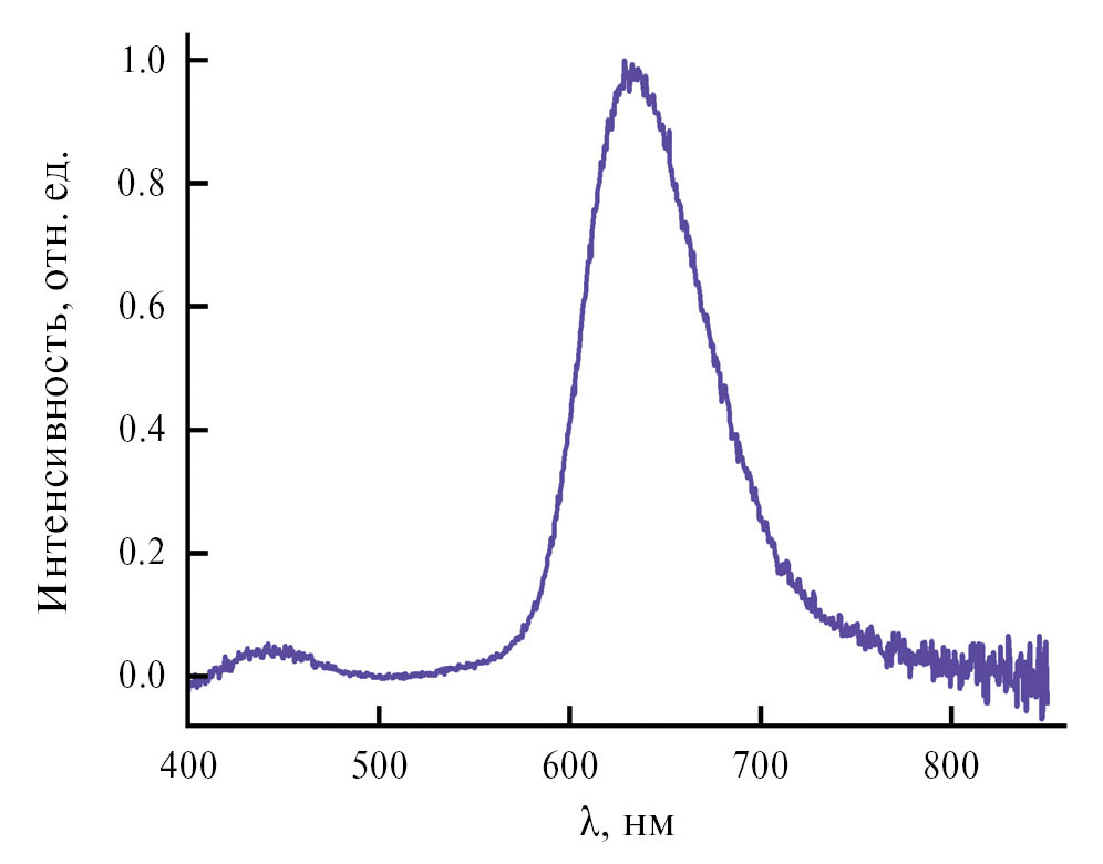 Для изменения вида и концентрации парамагнитных центров в образце применялось гамма-облучение от источника 60Co («кобальтовая пушка») в течении 10 часов с экспозиционной дозой 1.6×107 рад до заметного изменения окраски образца. Как известно [19, 20], гамма-облучение щелочно-галоидных кристаллов приводит к образованию центров окраски. Наиболее стабильными и имеющими высокую концентрацию являются анионная вакансия, захватившая электрон, F1 и агрегация двух F1-центров F2. Оба типа парамагнитных центров сказываются на скорости ядерной спин-решеточной релаксации. Концентрация F1-центров в необлученных щелочно-галоидных кристаллах при 300 K не превышает 1013 см–3 [19]. После облучения их число возрастает до 3 × 1017 см–3. Под действием гамма-облучения возможна и частичная перезарядка имеющихся в образце примесных ионов. Для выявления радиационных центров в исследуемом кристалле были получены спектры фотолюминесценции до и после облучения с использованием двойного монохроматора МДР-204-2 при температуре 5 K в гелиевом криостате замкнутого цикла «Janis Research Company». Если до гамма-облучения образца не наблюдалось линий, соответствующих центрам окраски, то, как видно на рис. 1, после гамма-облучения при оптической накачке с длиной волны 355 нм наблюдались линии люминесценции для F1-центров с максимумом около 440 нм и для F2-центров с максимумом около 630 нм.