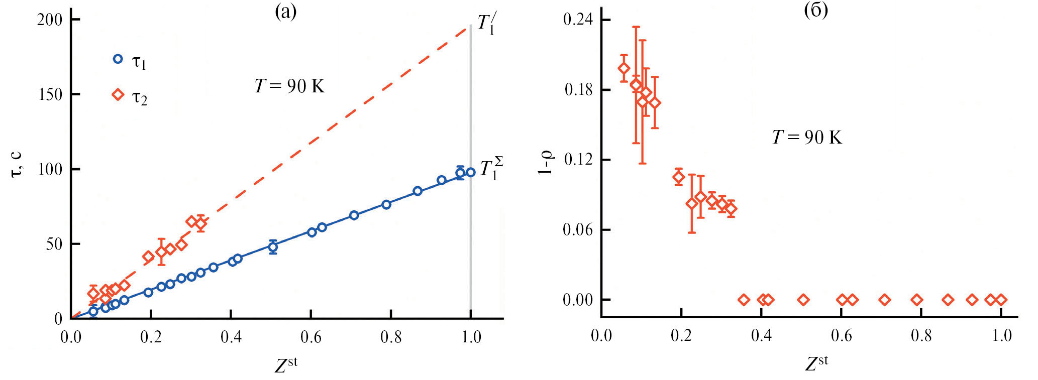 Рис. 2. (а) — Времена восстановления ядерной намагниченности 23Na τ1 и τ2 и (б) — соответствующие им значения весового коэффициента в зависимости от фактора стационарного магнитного насыщения Zst