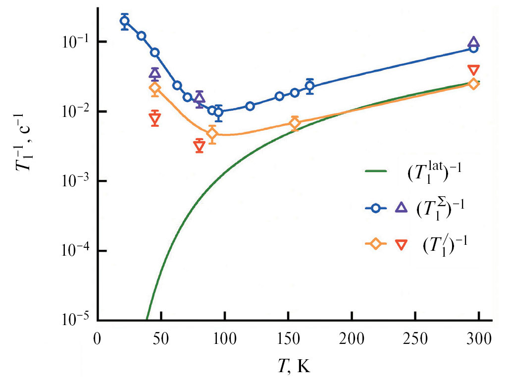 Эффективность взаимодействия ядерных спинов с тепловыми колебаниями кристаллической решетки характеризуется общей скоростью спин-решеточной релаксации . Для ядер, обладающих электрическим квадрупольным моментом, спин-фононное взаимодействие реализуется в основном за счет модуляции градиентов электрических внутрикристаллических полей при изменениях межатомных расстояний [1]. При колебаниях решетки изменяются также и магнитные поля, создаваемые соседними дипольными ядерными моментами. Такой магнитный механизм спин-фононной связи получил название механизма Валлера. Дальнейшие исследования показали, что механизм Валлера в диэлектрических твердых телах мало эффективен и не объясняет наблюдаемые скорости спин-решеточной релаксации [2]. Однако если по соседству с ядром находится парамагнитный центр, например, атом примеси с нескомпенсированным электронным магнитным моментом, то магнитное дипольное взаимодействие усиливается на порядки, что приводит к существованию эффективного «примесного» механизма спин-фононной связи. В реальных кристаллах даже в случае малых относительных концентраций парамагнитных примесей вплоть до порядка 10–7 [3] примесный механизм остается эффективным за счет участия в ядерной релаксации спиновой диффузии [4, 5]. Таким образом, для общей скорости спин-решеточной релаксации квадрупольных ядер можно записать: