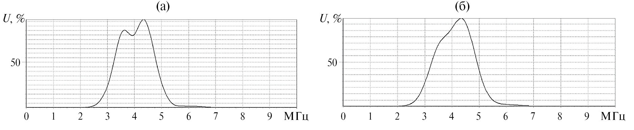На рис. 7 приведены энергетические спектры СШ, полученные при одной установке преобразователя (рис. 7а) и при вращении преобразователя вокруг вертикальной оси с угловым интервалом α = 15° и расчетом энергетического спектра по формуле (8) (рис. 7б). Рис. 7 показывает, что при дополнительном «угловом» усреднении энергетический спектр стал более симметричным. Однако более важным результатом является ожидаемое уменьшение его дисперсии в Nα. Экспериментальная проверка этого вывода приведена ниже.