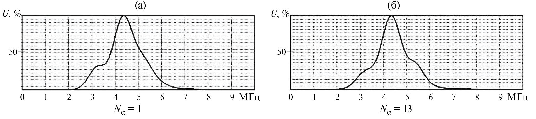 Рис. 7. Энергетические спектры СШ при (а) — одно- (Nα = 1) и (б) — многократной (Nα = 13) угловой установке преобразователя.
