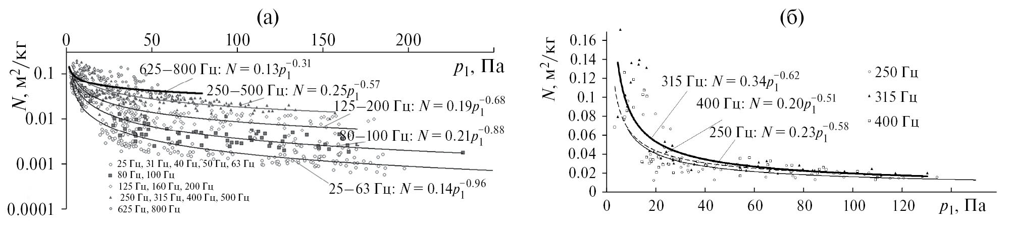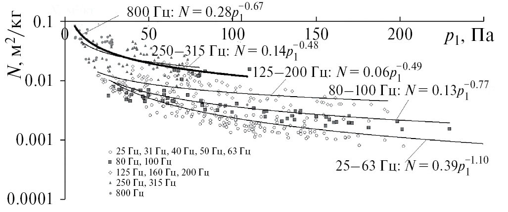 Из рис. 6 видно, что, как и при натурных испытаниях, особенно на низких частотах, наблюдалась тенденция ПАВ к понижению при росте внешнего акустического нагружения по степенному закону, что подтверждает объективность изучаемого явления.