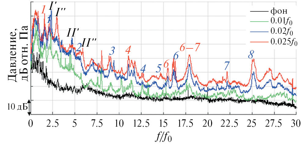 Рис. 6. Спектры давления для разных скоростей вращения гребного винта, черная кривая — уровень фоновой помехи. Синими цифрами отмечены синфазные моды колебаний, красными цифрами несинфазные моды