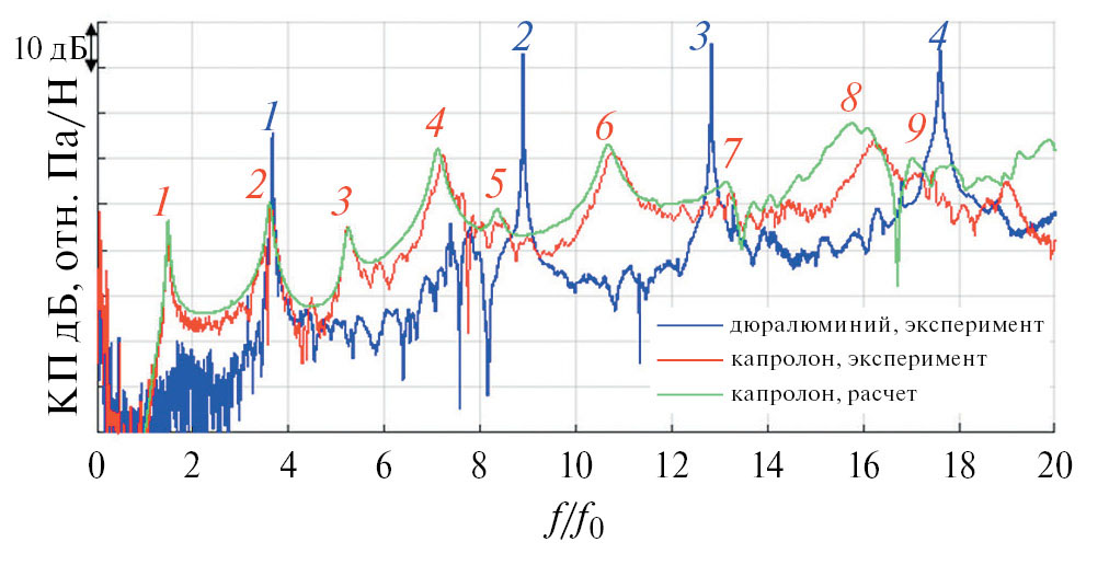 На рис. 10 изображено сравнение акустических откликов винтов в воде на ударное возбуждение при свободной подвеске. Измерение показывает, что для капролонового винта коэффициент затухания на нижних собственных формах 0.05, а для дюралевого винта — 0.004. Из-за большого затухания на высоких частотах резонансы капролонового винта перестают разрешаться и сливаются в широкополосные максимумы. Заметим, что величина падения добротности при переходе из воздуха в воду для разных материалов отличается почти в два раза и зависит от типа формы колебаний, т.е. излучение в среду для дюралевого винта существенно сказывается на суммарных потерях.
