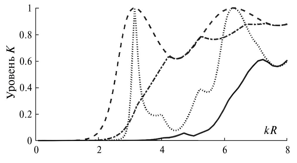 В качестве иллюстрации этого на рис. 1 приведены зависимости величины скомпенсированного интегрального уровня излучения K от kR для случаев расположения M = 4 и M = 10 компенсирующих источников на одной — штриховая и пунктирная линии, и на двух поверхностях — штрихпунктирная и сплошная линии, соответственно.
