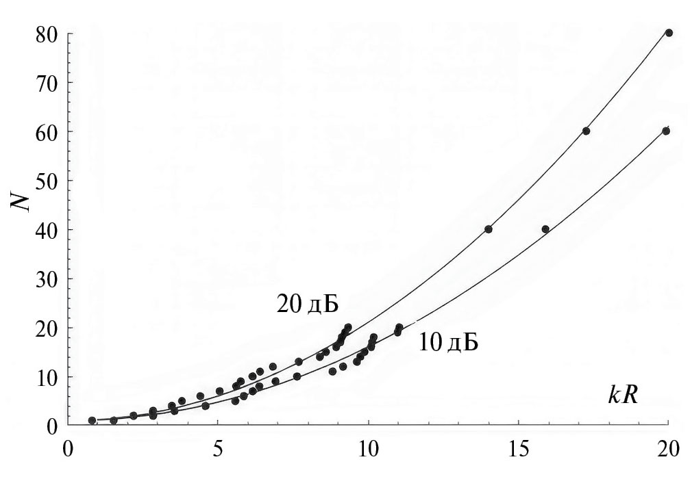На рис. 2 приведена зависимость от kR минимального числа компенсирующих источников, расположенных на каждой поверхности, требуемых для обеспечения подавления интегрального уровня излучения не хуже 20 дБ (величина K не более 0.01) и не хуже 10 дБ (величина K не более 0.1). Там же сплошными кривыми приведены аппроксимирующие зависимости N = 1 + 0.2(kR)2 и N = 1 + 0.15(kR)2 соответственно.