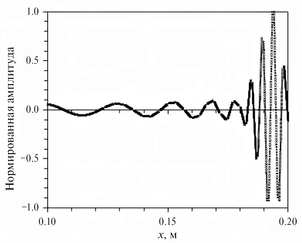 Рис. 4. Распределение нормированной амплитуды вдоль стержня (образец № 1) на особой частоте (52.9 кГц)