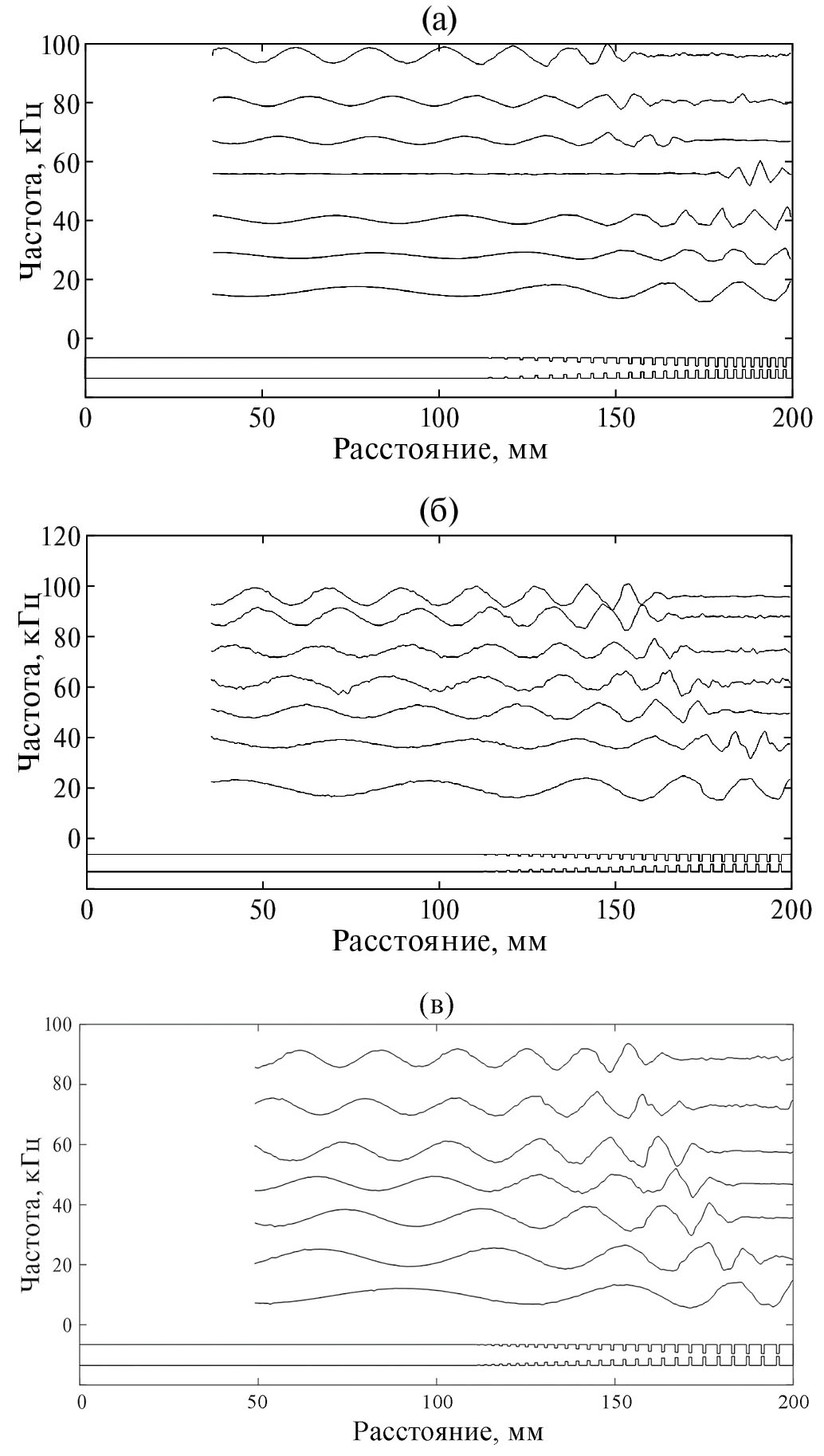 Для образцов № 1, 2 и 3 с помощью численного моделирования были определены собственные частоты и формы мод изгибных волн в диапазоне частот 1−100 кГц. С помощью преобразования Гильберта были рассчитаны функции, ортогональные исходным модам и восстановлены формы огибающих для этих мод. Распределение амплитуды некоторых изгибных мод вместе с соответствующими огибающими вдоль центральной линии поверхности стержня представлены на рис. 3. Частота каждой моды отображается на оси ординат таким образом, что ноль амплитуды колебаний моды соответствует значению ее собственной частоты. Под каждым графиком находится профиль образца стержня, которому соответствуют рассчитанные моды.