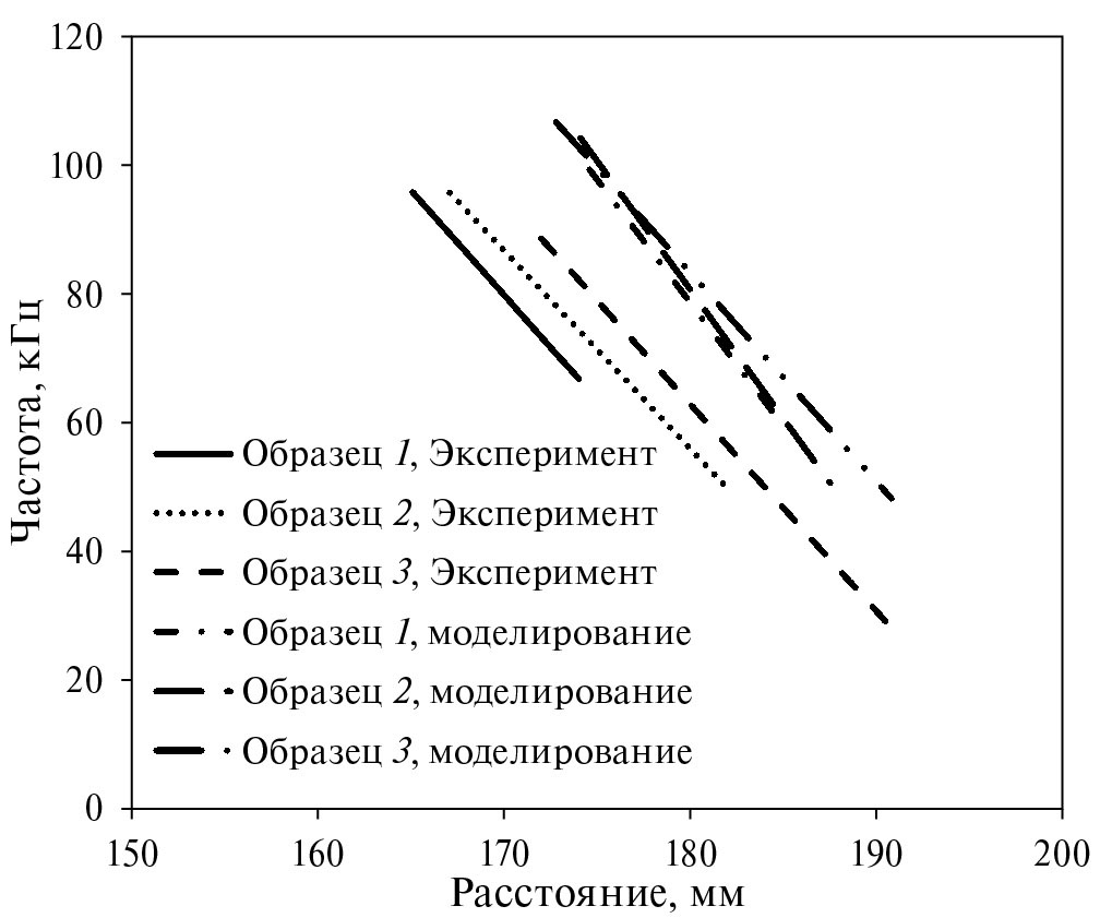 Для исследованных образцов были построены прямые, отделяющие область вблизи торца стержня, в которой на высоких частотах не распространялась изгибная волна. Проведено сравнение результатов этих расчетов для экспериментально измеренных распределений амплитуд мод с результатами моделирования (рис. 10). Как видно из рисунка, длина области, запрещенной для прохождения, для всех образцов увеличивается с частотой линейно и коэффициент пропорциональности примерно одинаков для всех образцов (3.2 ± 0.1) кГц/мм. Для моделирования разброс оказывается больше и равен (3.6 ± 0.4) кГц/мм. Интересно, что частота отсечки сильно зависит от типа геометрии образца: для образца № 1 эта частота равна примерно 60 кГц, для образца 2 примерно 40 кГц, для образца 3 – 25 кГц.