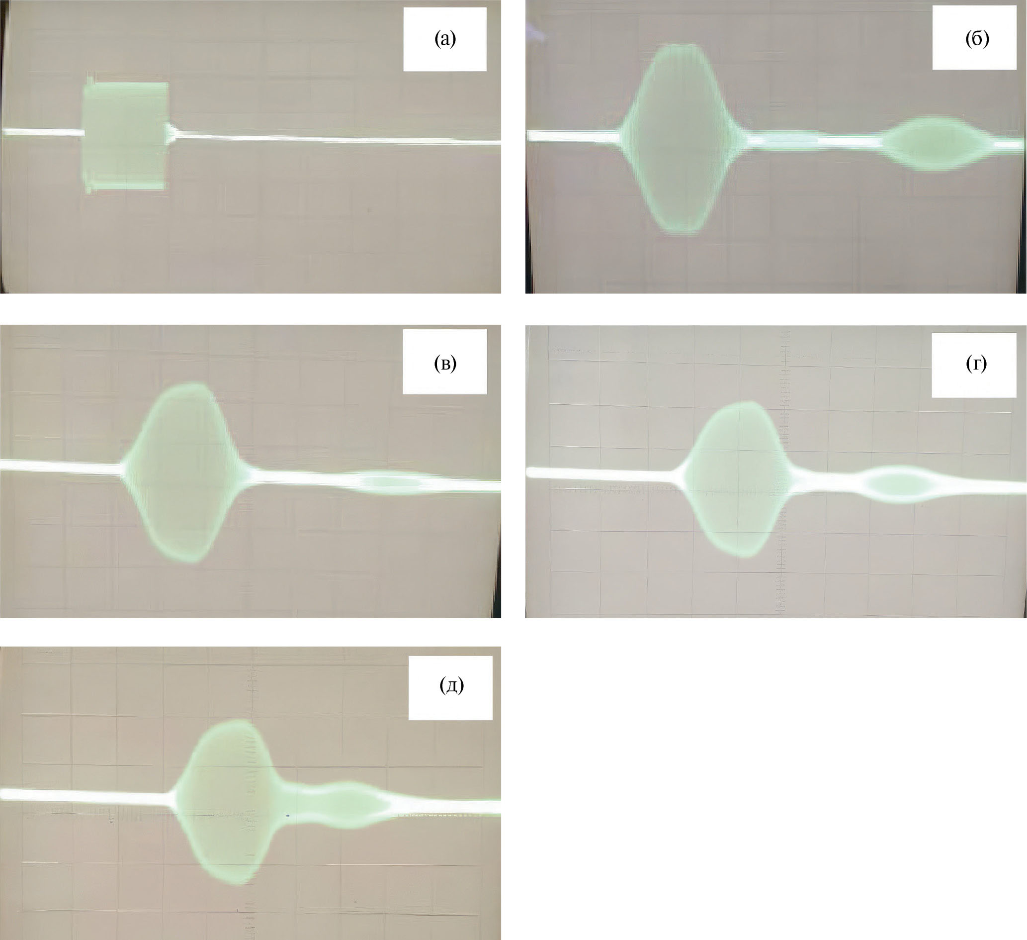 Рис. 6. Осциллограммы (а) – зондирующего сигнала и задержанного сигнала с расстоянием между ВШП (б) – 2 мм, (в) – 7 мм, (г) – 12 мм и (д) – 17 мм