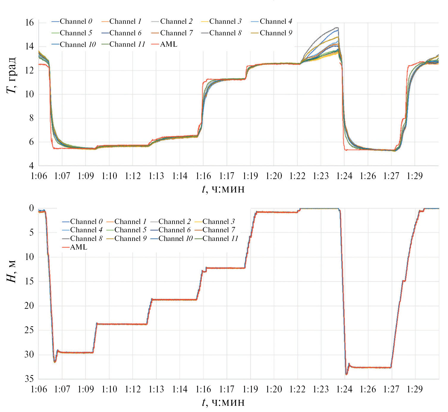 Рис. 5. Результат калибровки датчиков температуры и глубины системы «Моллюск-21» по записям CTD-зонда
