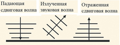 Рис. 1. Генерация звука при отражении сдвиговой волны от плоской границы (обратный эффект Константинова) [18].