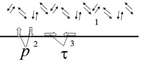 Рис. 3. Источники поля скорости в ТПС: 1 – лайтхилловские квадруполи, 2 – нормальные поверхностные диполи, 3 – касательные поверхностные диполи.