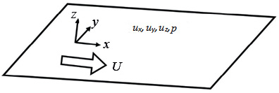 Геометрия постановки задачи и обозначения показаны на рис. 4. Ось x направлена по потоку, ось y - по нормали к обтекаемой плоскости, ось z - поперек потока. p x,y,z MathType@MTEF@5@5@+= feaahGart1ev3aqatCvAUfeBSjuyZL2yd9gzLbvyNv2Caerbov2D09 MBdbqedmvETj2BSbqeeuuDJXwAKbsr4rNCHbGeaGqik8fkY=xipgYl h9vqqj=hEeeu0xXdi9arFj0xirFj0dXdbba91qpK0=yr0RYxfr=Jbb f9q8aq0=yq=He9q8qqQ8frFve9Fve9Ff0dmeaabaqaciaacaGaaeqa baqabeGadaaakeaaqaaaaaaaaaWdbiaadchadaqadaWdaeaapeGaam iEaiaacYcacaWG5bGaaiilaiaadQhaaiaawIcacaGLPaaaaaa@3822@  - поле давления, u x ,  u y ,  u z   MathType@MTEF@5@5@+= feaahGart1ev3aqatCvAUfeBSjuyZL2yd9gzLbvyNv2Caerbov2D09 MBdbqedmvETj2BSbqeeuuDJXwAKbsr4rNCHbGeaGqik8fkY=xipgYl h9vqqj=hEeeu0xXdi9arFj0xirFj0dXdbba91qpK0=yr0RYxfr=Jbb f9q8aq0=yq=He9q8qqQ8frFve9Fve9Ff0dmeaabaqaciaacaGaaeqa baqabeGadaaakeaaqaaaaaaaaaWdbiaadwhapaWaaSbaaSqaa8qaca WG4baapaqabaGcpeGaaiilaiaaKdkacaWG1bWdamaaBaaaleaapeGa amyEaaWdaeqaaOWdbiaacYcacaa5GcGaamyDa8aadaWgaaWcbaWdbi aadQhaa8aabeaak8qacaa5Gcaaaa@3E61@  - проекции поля скорости u MathType@MTEF@5@5@+= feaahGart1ev3aqatCvAUfeBSjuyZL2yd9gzLbvyNv2Caerbov2D09 MBdbqedmvETj2BSbqeeuuDJXwAKbsr4rNCHbGeaGqik8fkY=xipgYl h9vqqj=hEeeu0xXdi9arFj0xirFj0dXdbba91qpK0=yr0RYxfr=Jbb f9q8aq0=yq=He9q8qqQ8frFve9Fve9Ff0dmeaabaqaciaacaGaaeqa baqabeGadaaakeaaqaaaaaaaaaWdbiaahwhaaaa@3229@  на оси координат. Иногда ниже вместо обозначения координат (x,y,z) используются обозначения (x1,x2,x3), а проекции скоростей обозначаются (u1,u2,u3).