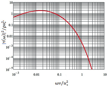 Полученные соотношения позволяют получить оценку верхней частотной границы, выше которой происходит резкий спад спектра касательных напряжений. Действительно, приравнивая глубину проникновения вихревых (вязких) волн толщине вязкого подслоя, получим: 2ν/ ω * =5 ν u * MathType@MTEF@5@5@+= feaahGart1ev3aqatCvAUfeBSjuyZL2yd9gzLbvyNv2Caerbov2D09 MBdbqedmvETj2BSbqeeuuDJXwAKbsr4rNCHbGeaGqik8fkY=xipgYl h9vqqj=hEeeu0xXdi9arFj0xirFj0dXdbba91qpK0=yr0RYxfr=Jbb f9q8aq0=yq=He9q8qqQ8frFve9Fve9Ff0dmeaabaqaciaacaGaaeqa baqabeGadaaakeaaqaaaaaaaaaWdbmaakaaapaqaa8qacaaIYaGaeq yVd4Maai4laiabeM8a39aadaWgaaWcbaWdbiaacQcaa8aabeaaa8qa beaakiabg2da9iaaiwdadaWcaaWdaeaapeGaeqyVd4gapaqaa8qaca WG1bWdamaaBaaaleaapeGaaiOkaaWdaeqaaaaaaaa@3D3D@ ,