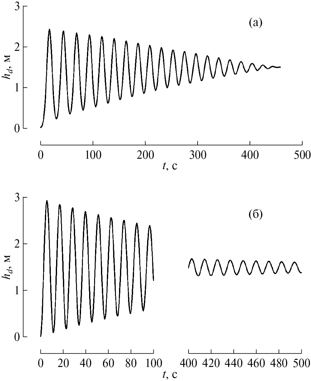Рис. 1. Зависимости высоты пылевой частицы радиуса a=0.105 мкм с переменным зарядом от времени, hd(t), характеризующие траекторию ее движения при θ = 87°: (а) –вычисленные на основе решения системы уравнений (1)–(2); (б) – вычисленные на основе решения уравнения (15).