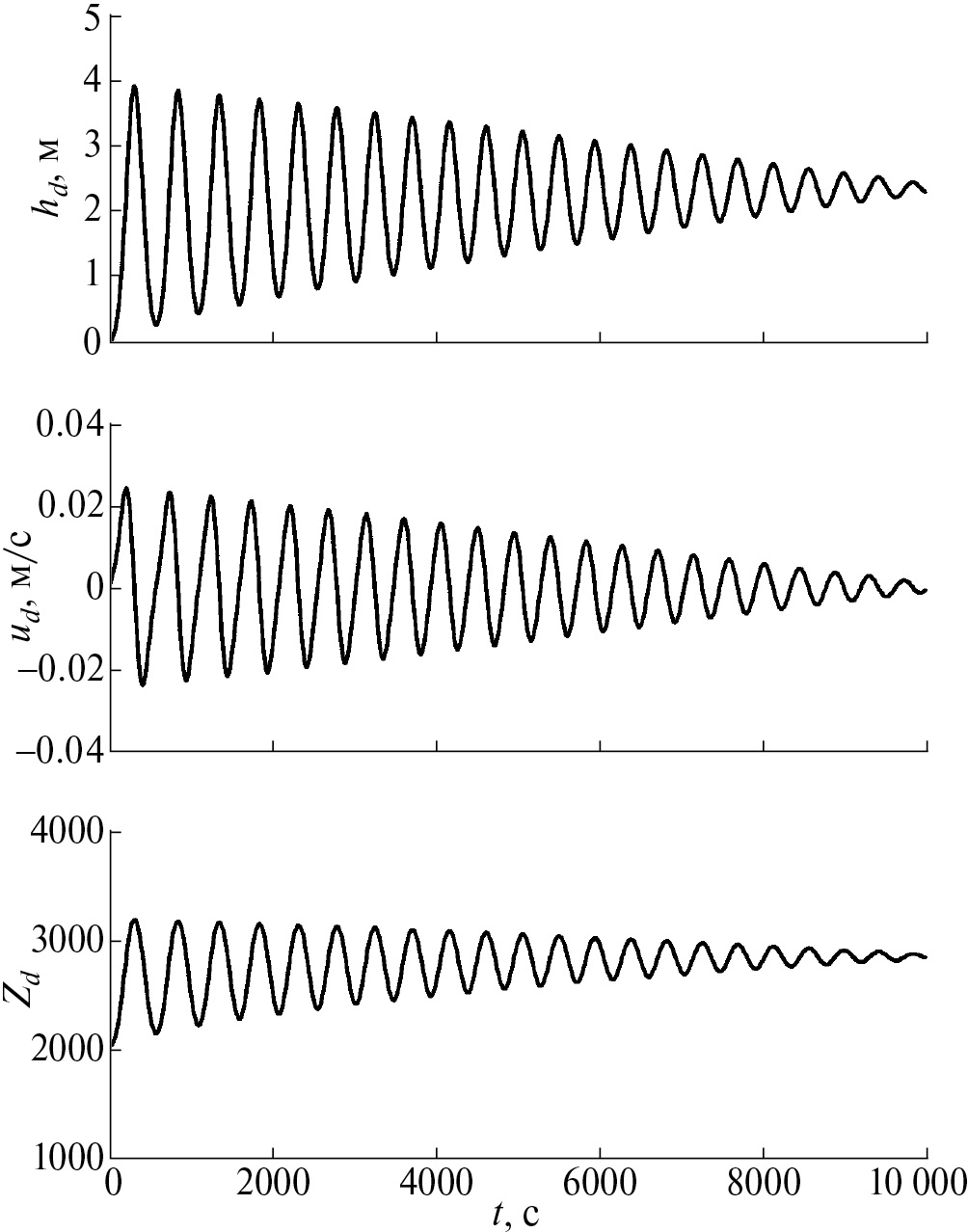Рис. 10. Осцилляции параметров, характеризующих траекторию движения пылевой частицы радиуса a = 1.768 мкм с изменяющимся зарядом над поверхностью Деймоса при θ = 87°: высота подъема hd, скорость ud, зарядовое число Zd.