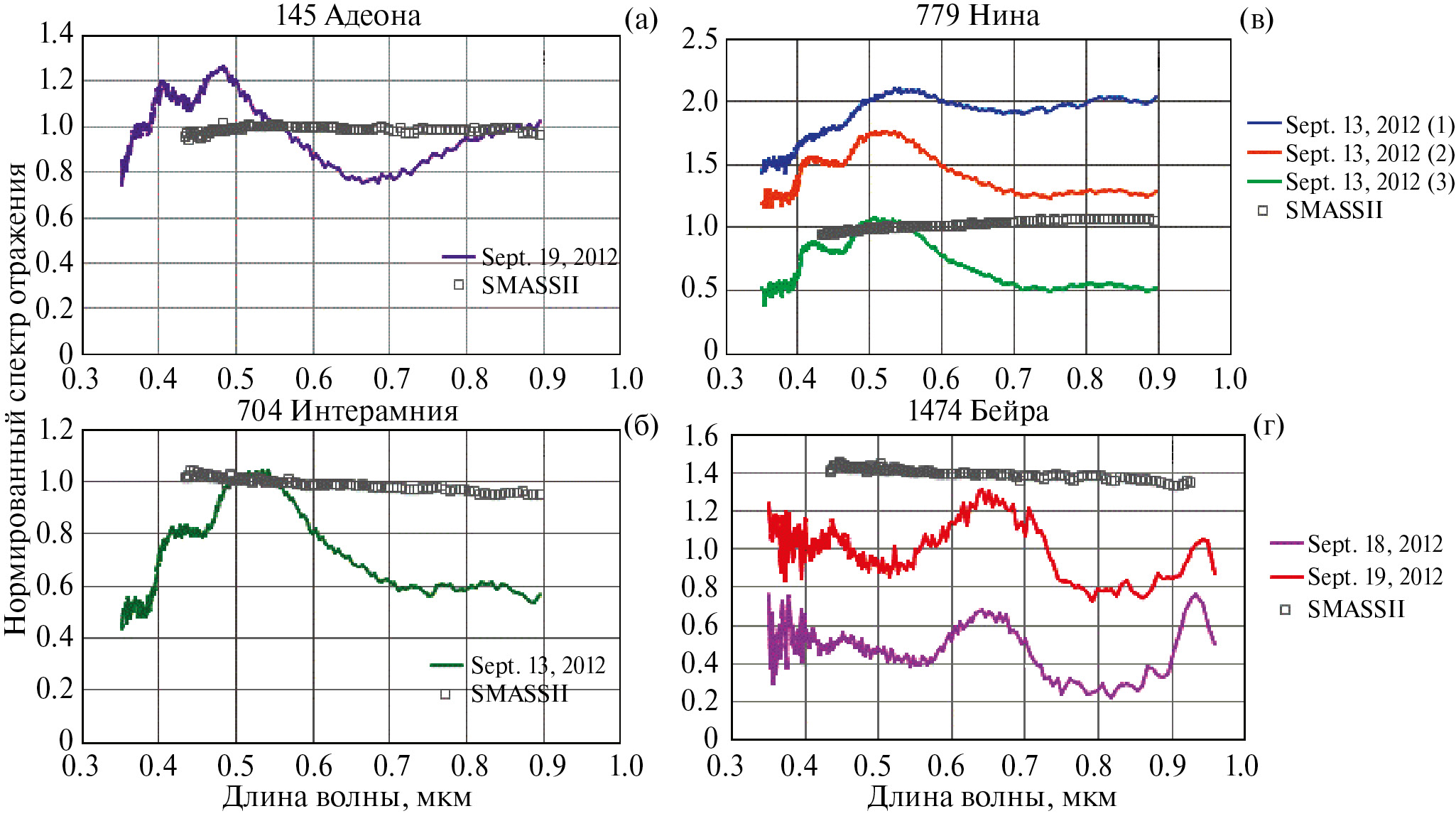 В качестве примеров на рис. 1 приведены нормированные спектры отражения АА Главного пояса 145 Адеоны (С или Сh), 704 Интерамнии (F или B), 779 Нины (Х) и Марс-кроссера 1474 Бейры (FX или B) (в скобках указана спектральная классификация Tholen (1989) или SMASSII, или только Tholen), полученные в сентябре 2012 г. во время максимума солнечной активности, когда астероиды находились вблизи перигелийных расстояний. Для сравнения черным цветом показаны спектры отражения из базы данных SMASSII, полученные ранее для тех же астероидов, но в спокойном состоянии. Относительные погрешности спектров отражения в центре видимого диапазона составляют 1–2% и возрастают вблизи его границ до 5–7% (Бусарев и др., 2016). Приведенные спектры астероидов измерены нами в диапазоне фазовых углов 13.9°–24.0°.