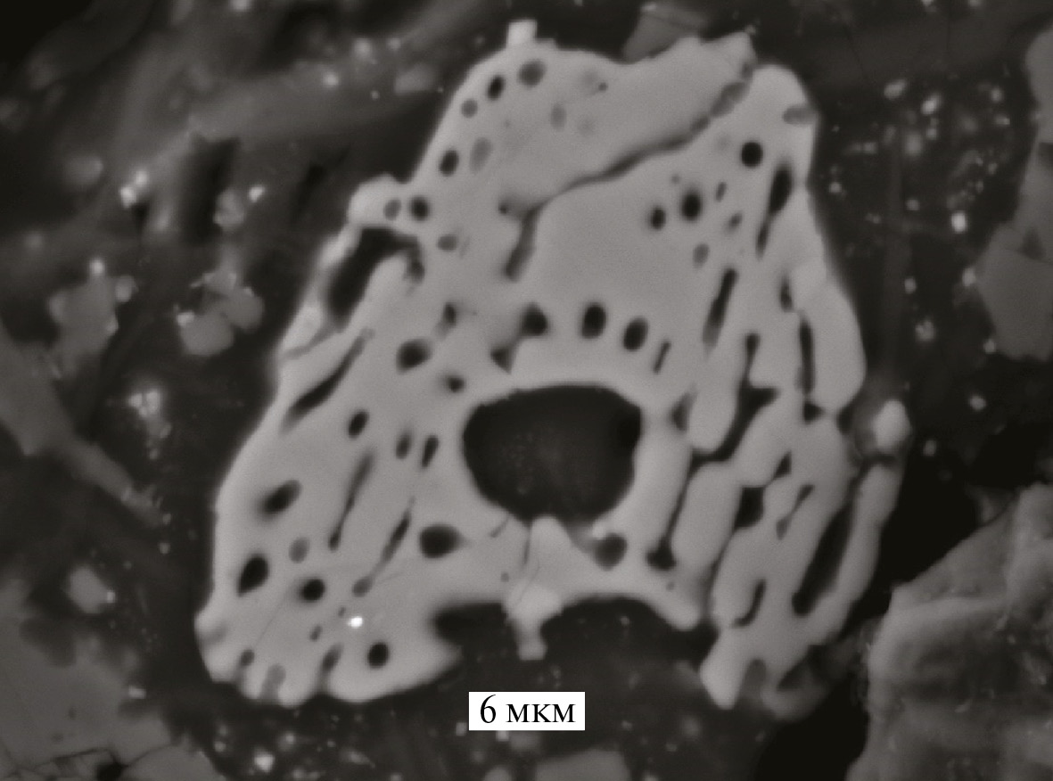 При изучении полированного образца из кратера Лонар в массе импактного стекла был обнаружен скелетный кристалл ильменита, в котором зафиксировано яркое по контрасту в отраженных электронах включение размером около 0.5 мкм (рис. 3). Обращает на себя внимание каплевидная форма обнаруженного включения. Небольшой размер обнаруженного включения не позволил получить карт распределения элементов для подтверждения самородного его состояния. Однако достаточно яркий контраст в отраженных электронах по сравнению с окружающей кислородсодержащей ильменитовой матрицей позволил нам сделать вывод об отсутствии кислорода в этом включении. Количественный расчет с учетом влияния состава вмещающего ильменита показал, что состав включения следующий: (Ni2.81Cr0.25)3.06Cu0.94, что близко соответствует метрике Ni3Cu.