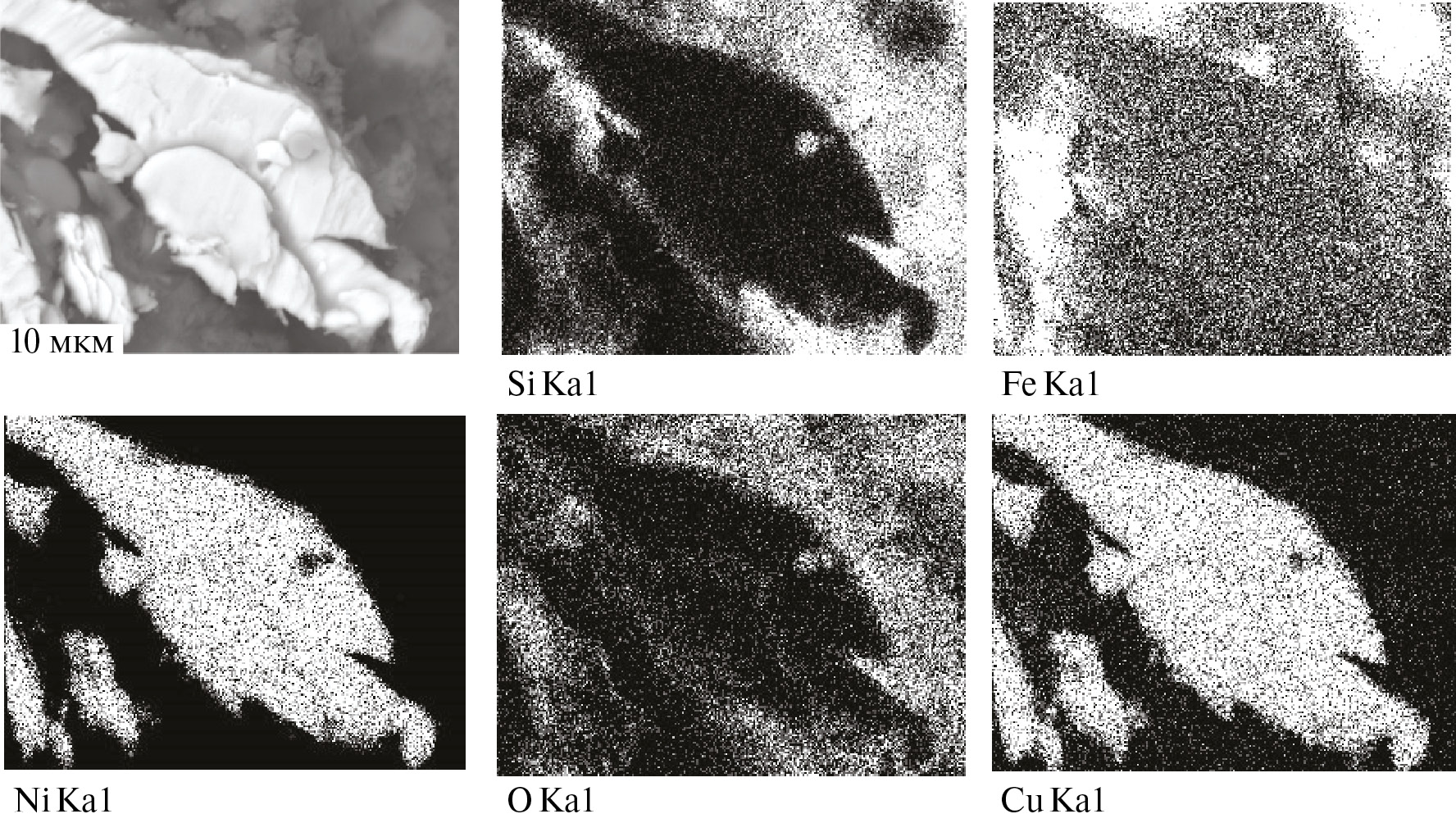 Рис. 6. Частицы Ni2Cu в матрице импактного стекла. Кратер Лонар. СЭМ, отраженные электроны, рентгеновское характеристическое излучение.