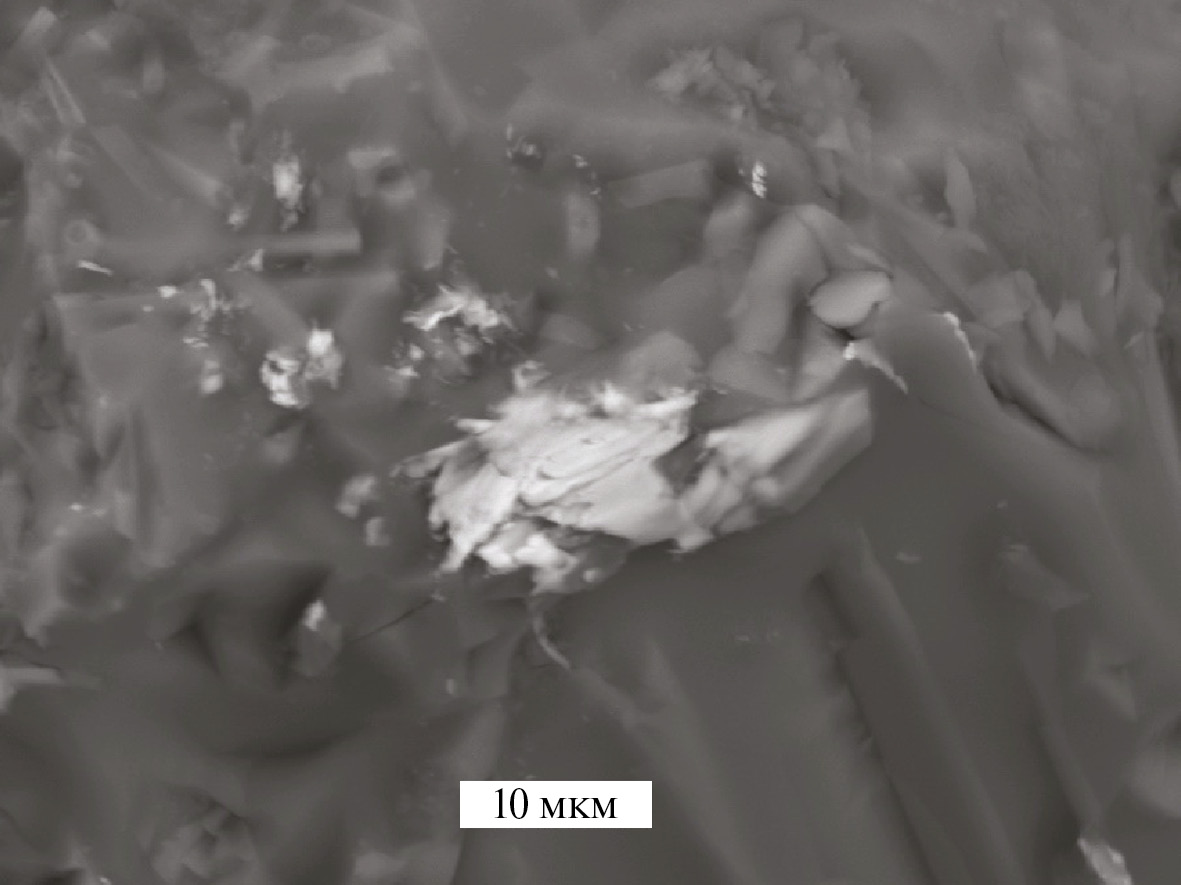 В нескольких образцах импактного стекла из кратера Лонар были обнаружены яркие по контрасту в отраженных электронах листовидные Ni–Cu содержащие частицы размером от 10 до 30 мкм (рис. 4). На снимке во вторичных электронах видно, что обнаруженные частицы утоплены в стеклянной матрице, а также покрыты стеклянной пленкой. Кроме того, на поверхности самой крупной частицы зафиксировано несколько стеклянных шариков размером 2 и 0.5 мкм. Размер и морфология этих шариков указывают на их расплавную природу.