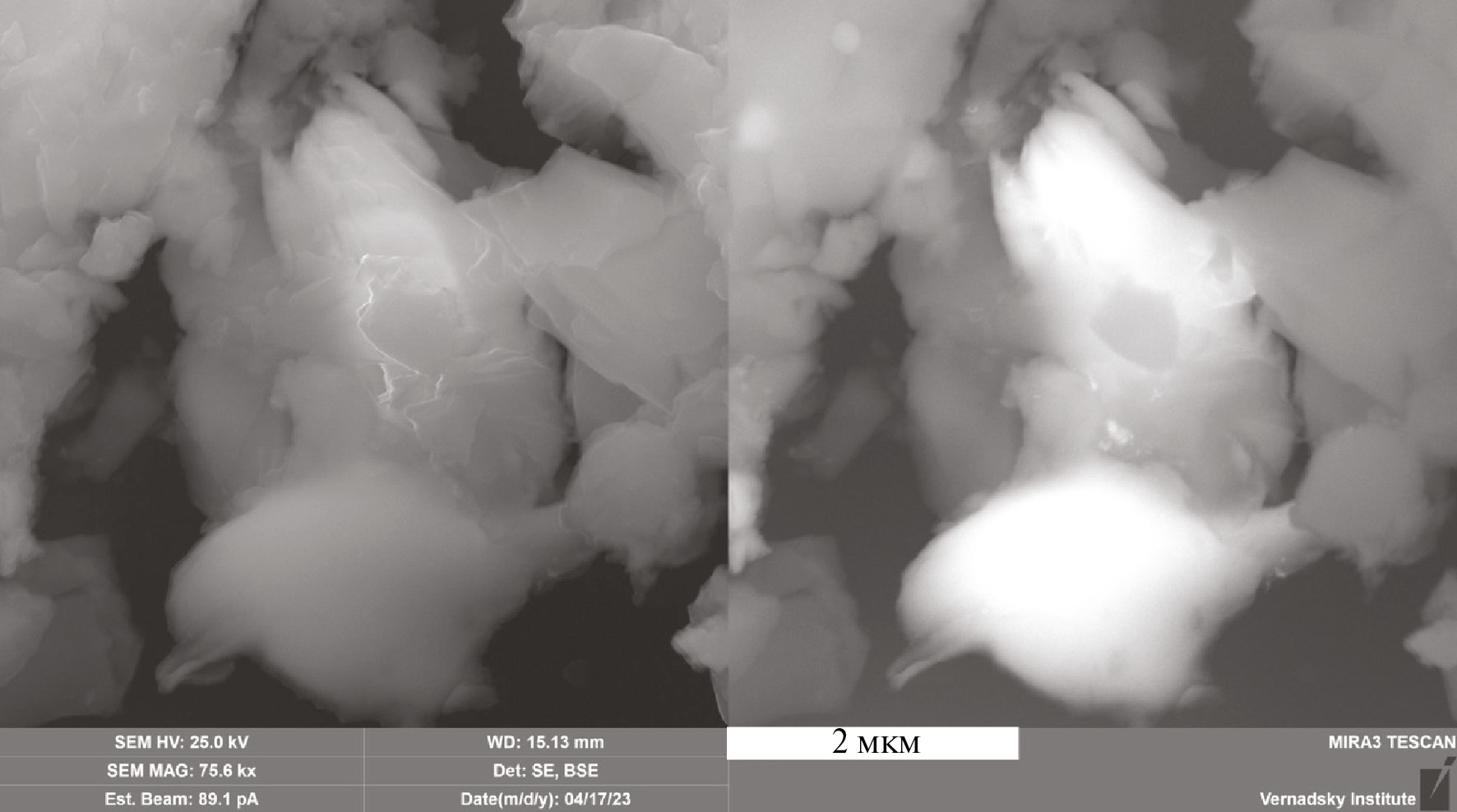 Рис. 7. Агрегат листовидных частиц Ni2Cu в матрице стекла лунного реголита. Луна-24. СЭМ. Слева – вторичные электроны. Справа – отраженные электроны.