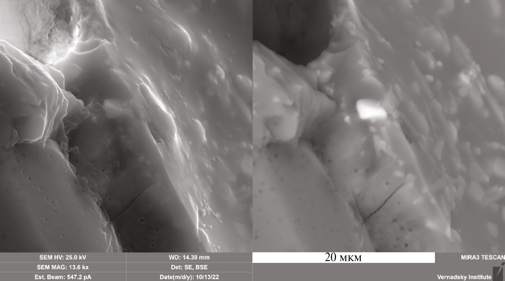 Рис. 9. Частица Ni2Cu в матрице стекла лунного реголита. Луна-24. СЭМ. Слева – вторичные электроны. Справа – отраженные электроны.