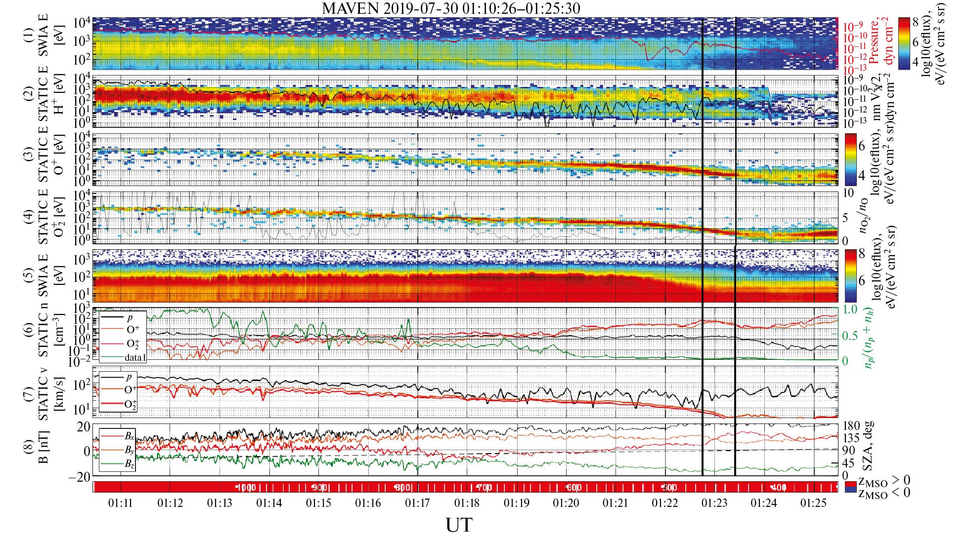 Рис. 9. 30 июля 2019 г., в 01:10:26 – 01:20:30 по восточному времени. Данные MAVEN включают магнитослой, магнитопаузу, магнитосферу и ионосферу. Панели сверху вниз: 1 – дифференциальная энергия-время суммы всех ионов; 2 – дифференциальная энергия-время протонов H+; 3 – дифференциальная энергия-время кислорода O+; 4 – энергия-время кислорода O2+; 5 – дифференциальная энергия-время энергии электронов; 6 – цветные линии плотности ионов (пояснения в прямоугольнике справа) и относительная плотность ионов и протонов (зеленые линии); 7 – скорости трех ионов (пояснения в прямоугольнике справа); 8 – компоненты магнитного пола в системе координат Солнечной орбиты, ориентированной на Марс (MSO) (пояснения цвета даны справа) и величина магнитного поля (черная линия). Красная цветовая полоска внизу показывает, что спутник находится в северном полушарии. Две вертикальные черные полосы приближенно показывают область магнитопаузы. Сектор между двумя вертикальными линиями указывает место, где происходит вращение магнитного поля.