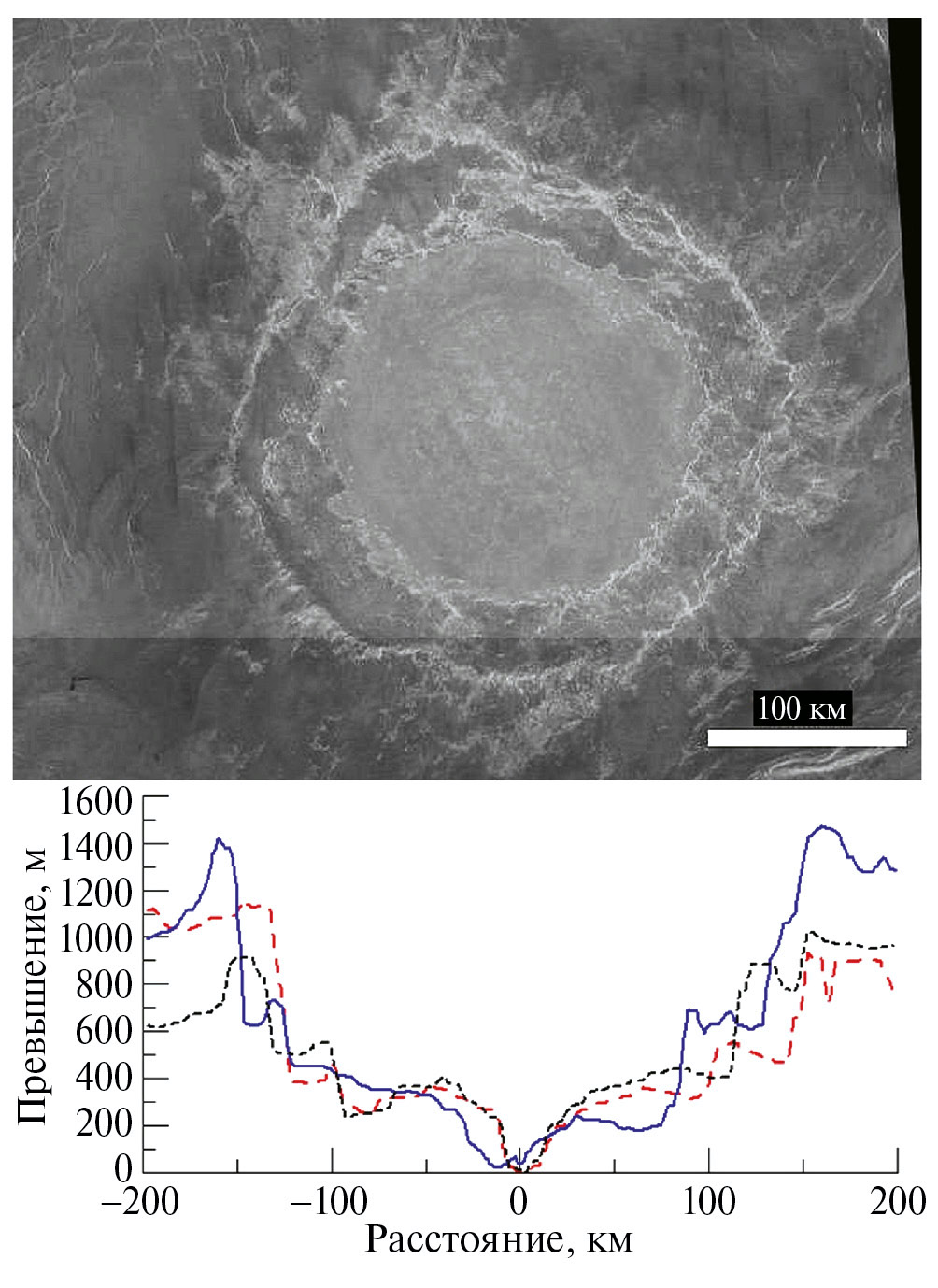 Оценка частоты ударов астероидов одного размера (“болидное отношение”) составляет примерно 0.7 от земного значения (см. обзор Werner, Ivanov, 2015). На Венере с оценкой глобального возраста поверхности менее 1 млрд лет наблюдаются 10 кратеров с диаметром более 100 км и один кратер диаметром боле 200 км (кратер Мид, D = 270 км, рис. 1). Шкала высот/глубин дана относительно самой глубокой измеренной точки вблизи центра кратера. Волнообразные участки местности вокруг кратера ограничивают точность определения глубины в пределах от 1 до 1.4 км. Более точные профили по первичным данным радиовысотомера в работе (Ivanov, Ford, 1993) дают примерно такую же картину (см. рис. 2 в работе (Иванов, 2005))