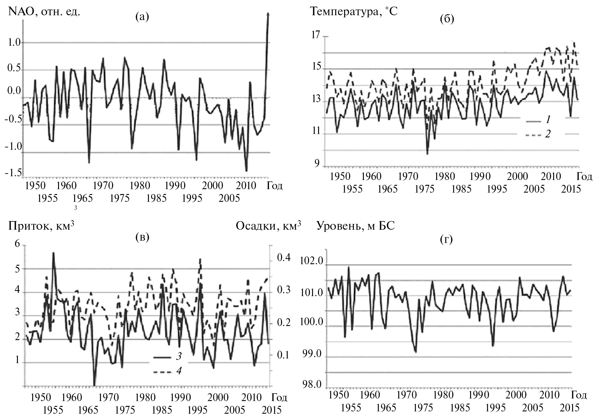 Рис. 2. Многолетняя динамика гидрометеорологических характеристик Рыбинского водохранилища: а — годовой индекс NAO; б — средняя за вегетационный сезон температура воздуха (1) и воды (2); в — объем поверхностного притока (3) и осадков на зеркало водохранилища (4); г — уровень воды в водохранилище.
