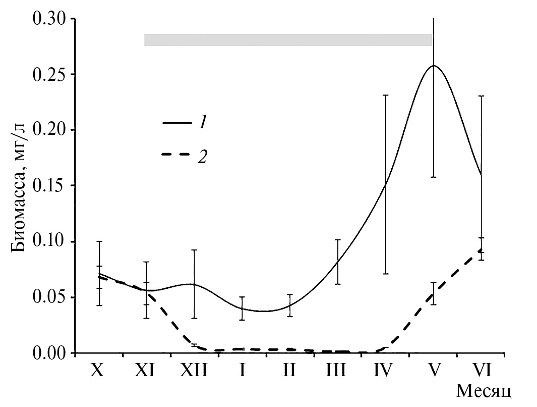 Рис. 2. Сезонная динамика биомассы фитопланктона с октября по июнь в оз. Кривое (1) и оз. Круглое (2). Серым цветом обозначен период ледостава. Приведены средние данные 2019–2021 гг.