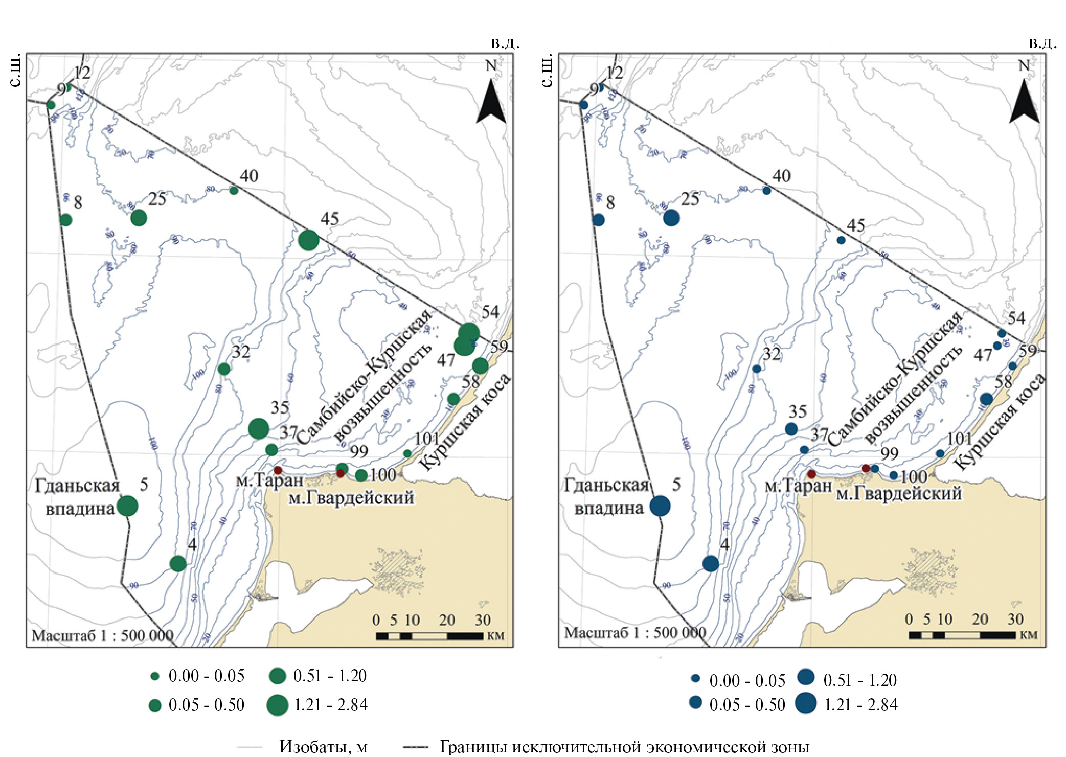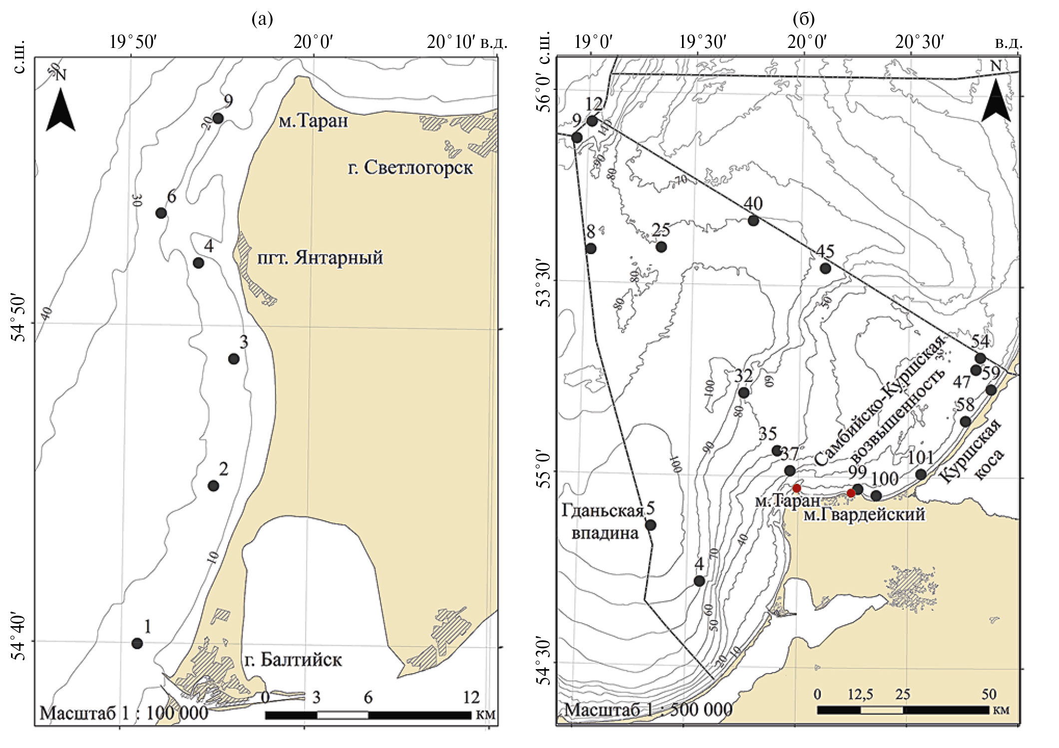 Рис. 1. Расположение станций отбора проб: а — западное побережье Самбийского п-ова, юго-восточная часть Балтийского моря, октябрь 2020 г., б — исключительная экономическая зона России, октябрь–ноябрь 2021 г. · — номера станций.