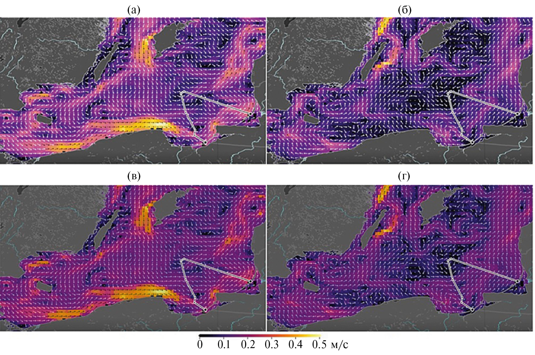 Рис. 2. Пространственная структура полей течений в поверхностном слое воды в центральной и юго-восточной части Балтийского моря: а — 23.10.2021, б — 30.10.2021, в –12.10.2020, г –15.10.2020 (0.0–0.5 м/с — диапазон изменения скорости течений).