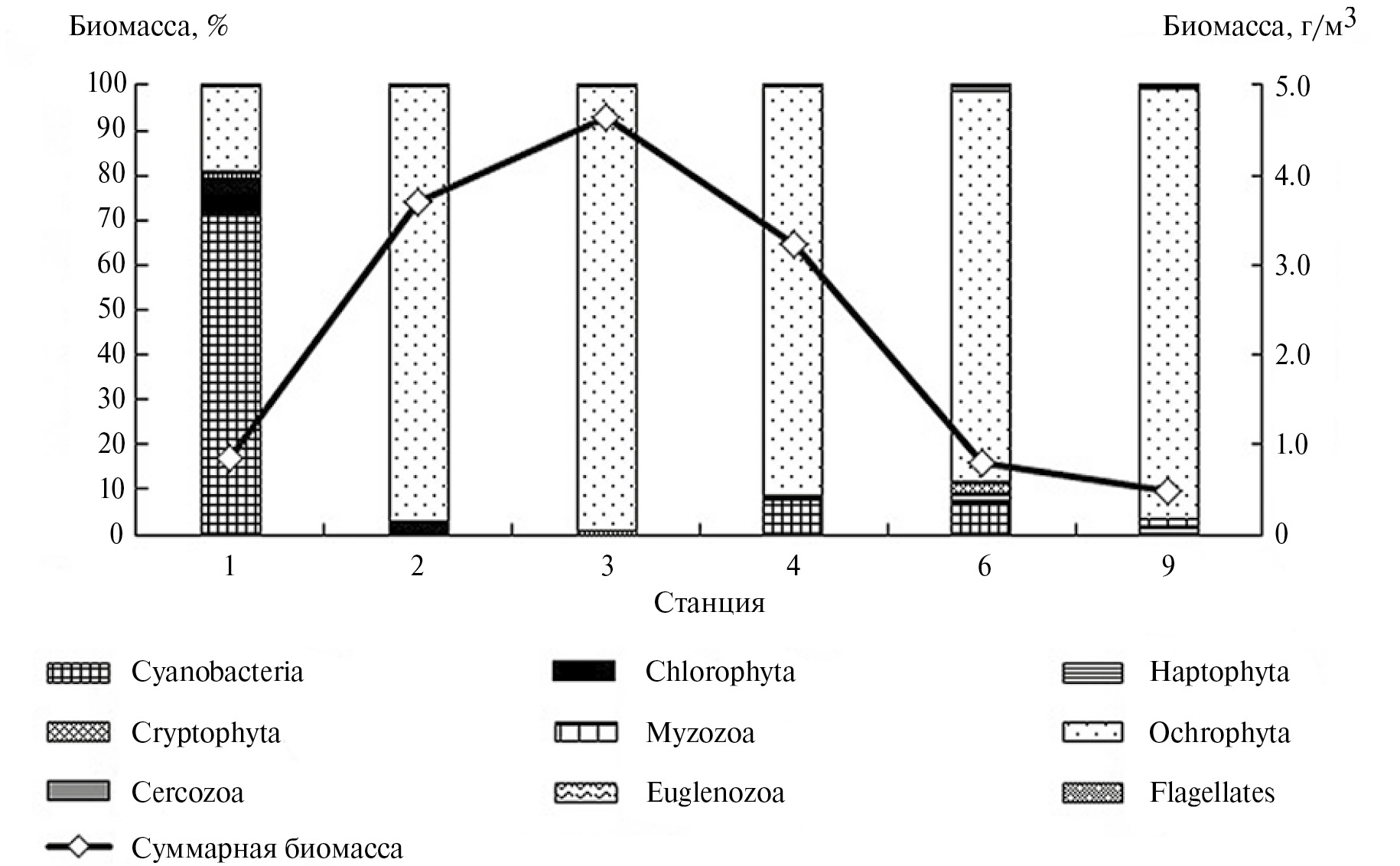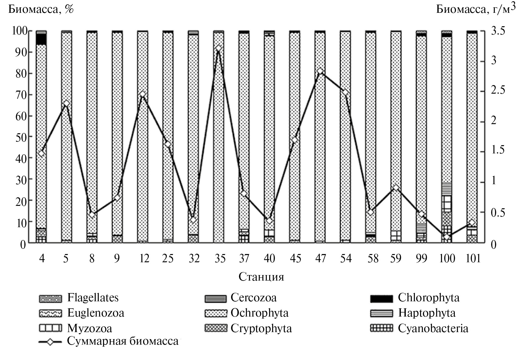 Рис. 3. Распределение относительной биомассы систематических групп фитопланктона (%) (левая ось ординат) и суммарной биомассы (г/м3) (правая ось ординат) в юго-восточной части Балтийского моря в октябре–ноябре 2021 г.
