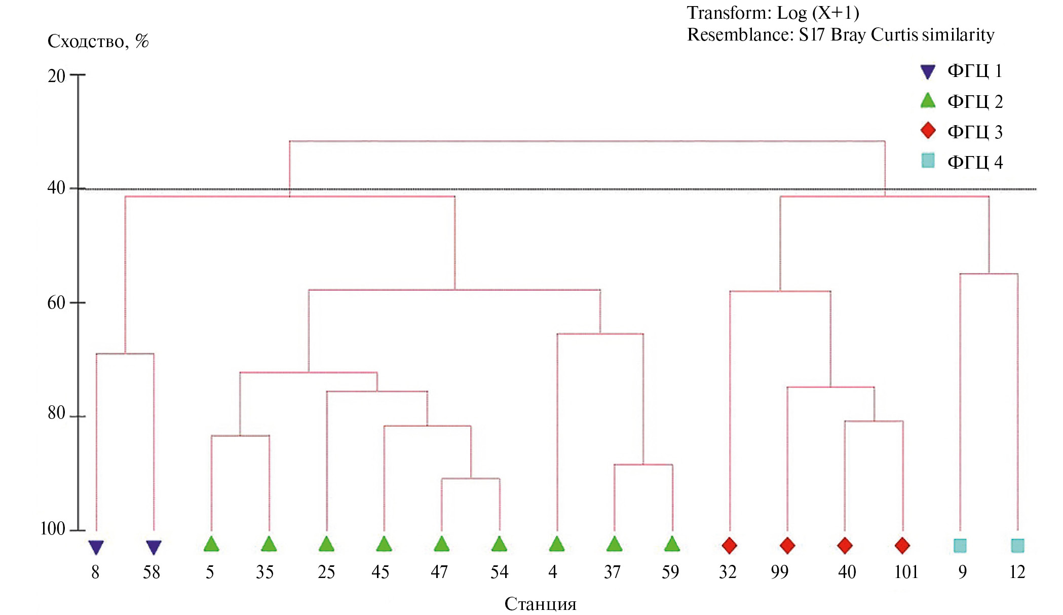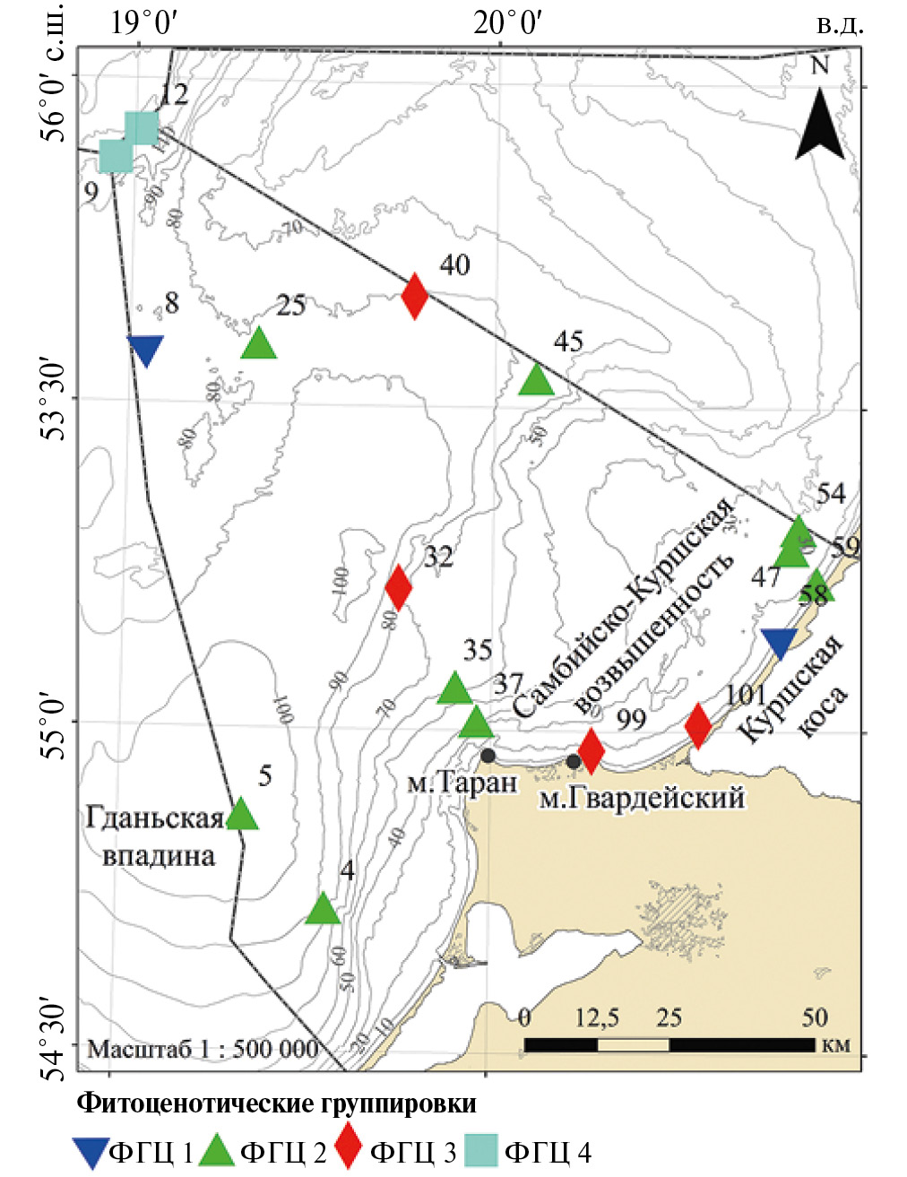 Кластерный анализ структуры фитопланктона показал, что на уровне сходства 40% выделялись четыре группы станций. Поскольку на основании R-статистики ANOSIM теста достоверность выделения проб на группы была получена только для двух групп станций (II и III), то группы станций рассматривали не как отдельные сообщества, а как фитоценотические группировки с различающейся структурой (далее ФЦГ 1–4). Группа станций I объединяла две точки, находящиеся на значительном удалении друг от друга: одна (ст. 8) расположена в районе Гданьско-Готландского порога (государственная граница с Польшей), другая (ст. 58) – в прибрежной зоне Куршской косы (рис. 5, 6).