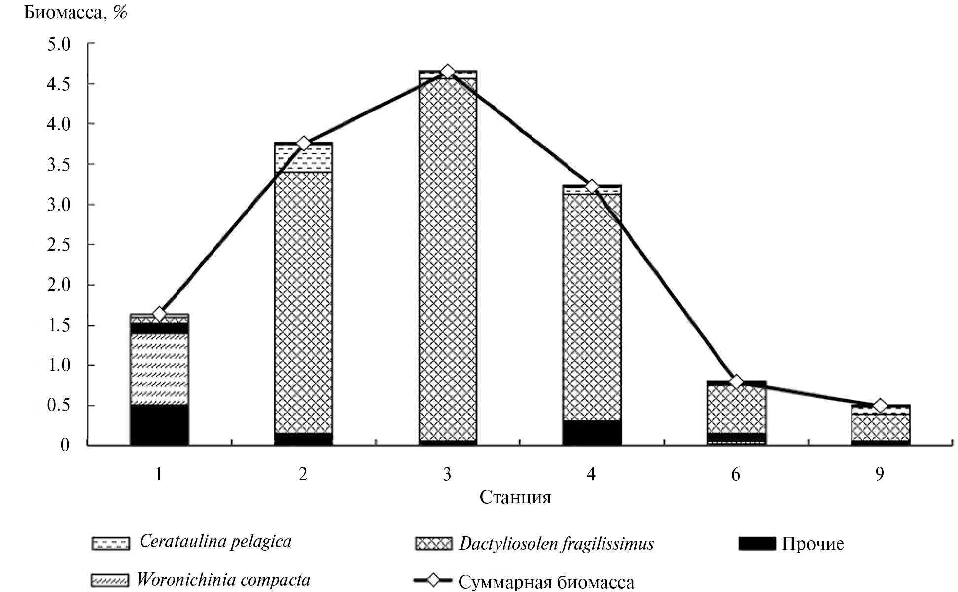 Основной вклад в численность и биомассу фитопланктона вносили диатомовые, они доминировали вдоль всего побережья. Исключением была ст. 1, расположенная в районе Балтийского пролива, где доминантный комплекс представляли, в основном, цианобактерии. Основной вклад в биомассу на этой станции вносила мелкоклеточная колониальная микроводоросль Woronichinia compacta (Lemmermann) Komárek & Hindák 1988, с биомассой 0.88 г/м3. Далее, в направлении м. Таран, доминантный комплекс изменился, основная доля количественных показателей фитопланктона приходилась на диатомовые микроводоросли. Среди них доминировал Dactyliosolen fragilissimus с биомассой 0.07–4.5 г/м3 (в среднем 1.9 ± 0.7 г/м3). Максимальная биомасса была зафиксирована в районе ст. 3, снижаясь в направлении м. Таран. В этом районе Cerataulina pelagica выступала в роли субдоминанта с биомассой 0.03–0.1 г/м3 (в среднем 0.11 ± 0.05 г/м3) (рис. 9).