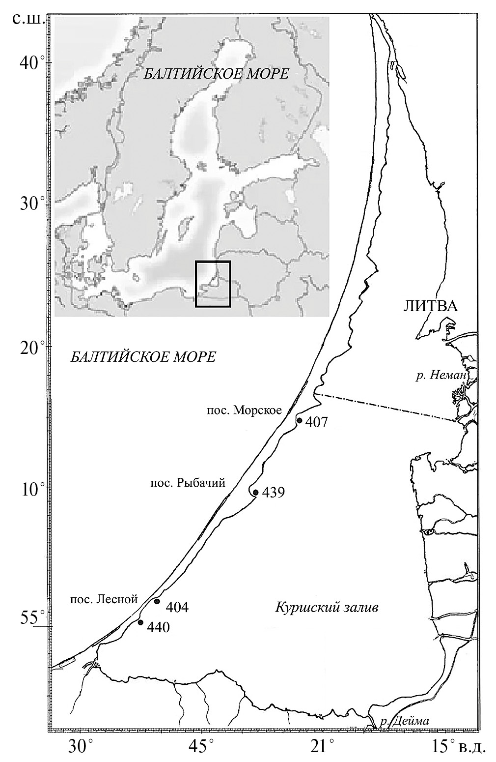 Пробы воды для определения содержания цианотоксинов отбирали в литорали западного побережья Куршского залива, из поверхностного горизонта 0–50 см, на четырех постоянных мониторинговых станциях, расположенных в центральной и южной частях Куршской косы и различающихся по гидрологическим, седиментологическим и биотопическим признакам (рис. 1). Станции 407 и 439 расположены в прибрежной зоне средней части Куршской косы, вблизи населенных пунктов, в центральном гидрологическом районе залива, находящемся под влиянием речного стока р. Неман. Станция 439, расположенная в бух. Черногорская, пос. Рыбачий, кроме природных гидрологических факторов, может испытывать воздействие антропогенного биогенного загрязнения. Станции 404 и 440 расположены в южной, кутовой части залива. Станция 440 находится вблизи пос. Лесной, ст. 404 – в небольшой бухте с развитым поясом высшей водной растительности, способствующим замедленному водообмену.