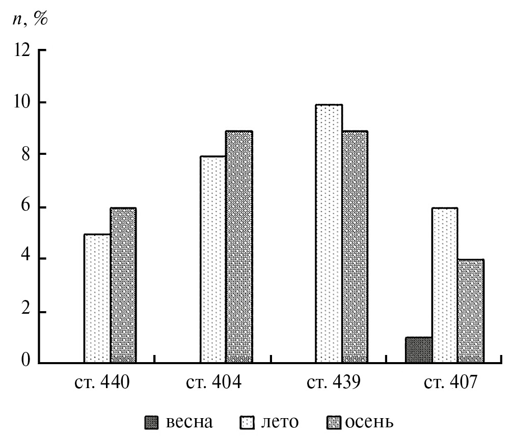 Рис. 2. Частота встречаемости проб, положительных на микроцистины, на станциях наблюдения в разные сезоны 2011–2018 гг.