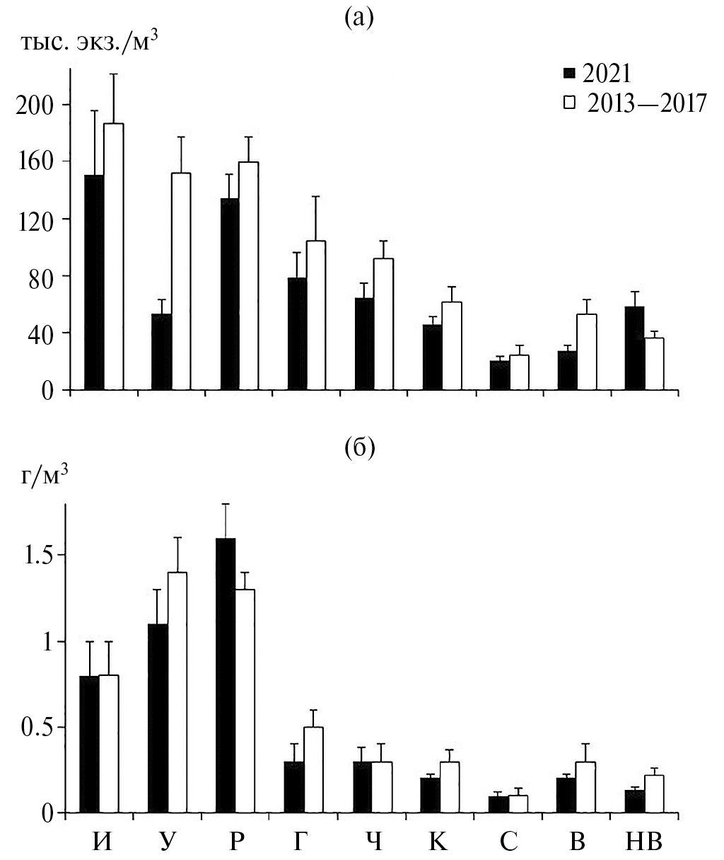 Средняя биомасса зоопланктона в Горьковском вдхр. в августе 2021 г. была низкой (0.3 г/м3), на речном участке водоема– <0.1 г/м3, на озерном – ≤0.8 г/м3. Это сопоставимо с таковой (0.2‒0.7 г/м3) в 2000‒2010‑х годах в речной части водоема (Ривьер, 2007; Шурганова, 2007; Lazareva et al., 2014). На его озерном участке в конце лета биомасса обычно выше и достигает 1‒4 г/м3 (Ривьер, 2007; Lazareva et al., 2014; Шурганова и др., 2017; Лазарева и др., 2018а).