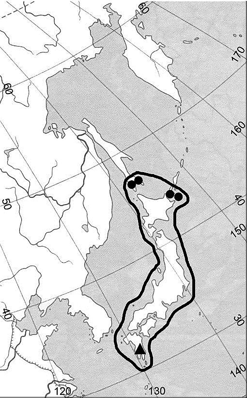 Имеющиеся в нашем распоряжении материалы свидетельствуют в пользу того, что T. japonica — предположительно океанический вид. Его достоверный ареал охватывает юг РДВ в пределах Сахалинской обл. Российской Федерации (крайний юг о. Сахалин и обеих гряд Курильского архипелага (острова Юрий и Кунашир)), а также южную Японию, где вид пока найден только на о. Кюсю (Miquel, 1867) (рис. 5).