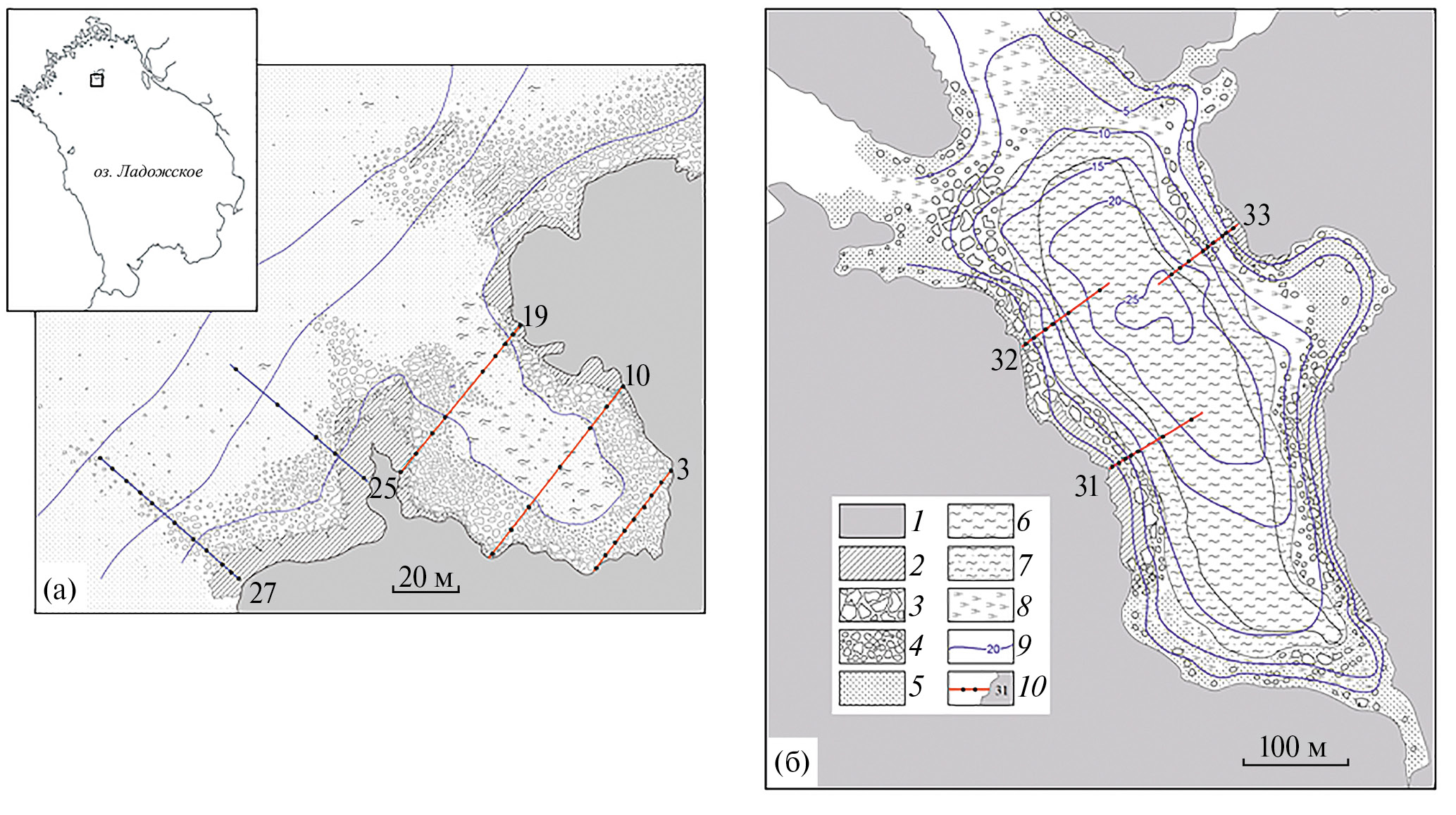 Рис. 1. Схема рельефа и грунтов Малой Никоновской бухты (а), залива Крестовый (б) и расположение разрезов. 1 – суша, 2 – скала, 3 – обломки скал, 4 – валуны, 5 – песок, 6 – ил, 7 – песчаный ил, 8 – растительный детрит, 9 – изобаты, 10 – разрез со станциями и номерами разрезов.