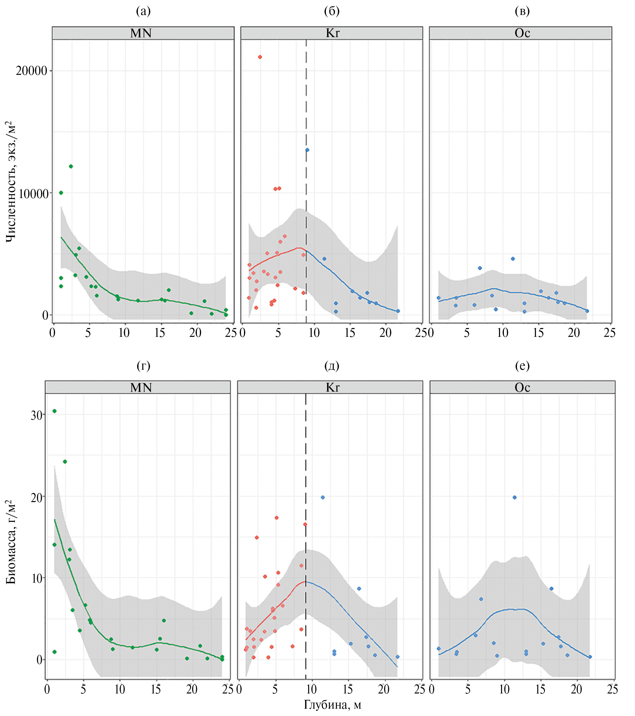 Рис. 2. Тенденция изменения с глубиной численности (а–в) и биомассы (г–е) зообентоса в закрытой бухте Малая Никоновская (а, г), полузакрытой бухте зал. Крестовый (б, д) и на открытом побережье (в, е). Вертикальная пунктирная линия — граница глубины, затененная область — 95%-ный доверительный интервал показателя.