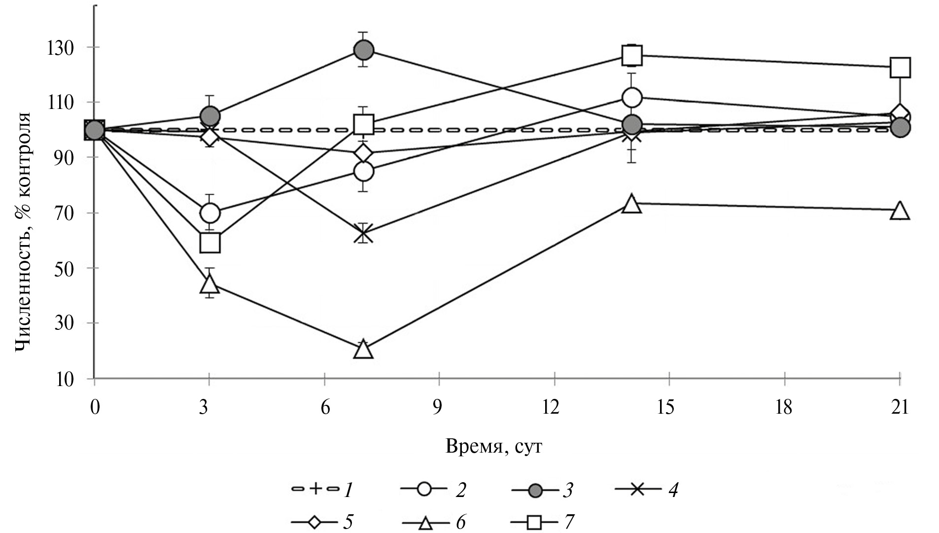 3. Рис. 2. Изменение относительной численности клеток S. quadricauda (% контроля) в присутствии зольного остатка смеси разных видов макропластика. 1 – контроль, 2 – 0.01 мг/л, 3 – 0.1 мг/л, 4 – 1 мг/л, 5 – 10 мг/л, 6 – 100 мг/л, 7 – 1000 мг/л.