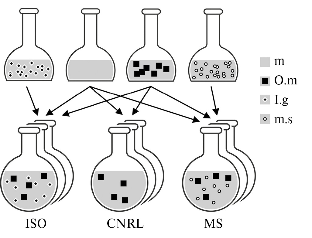 Рис. 1. Схема приготовления экспериментальных суспензий в контроле (CNRL) и опытах с микроводорослями I. galbana (ISO) и пластиковыми микросферами (MS) из следующих компонентов: m — питательной среды, O.m. — маточной культуры динофлагелляты O. marina, I.g. — маточной культуры I. galbana, ms — суспензии пластиковых микросфер.