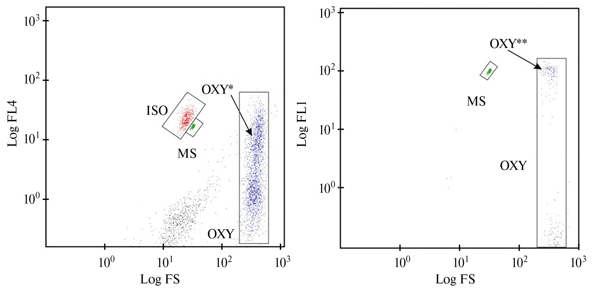 Рис. 2. Графики для расчета общей численности (метод гейтинга) гетеротрофной динофлагелляты O. marina (OXY) и ее кормовых объектов — микросфер (MS) и гаптофитовой микроводоросли I. galbana (ISO) на 2-параметрических цитограммах прямого светорассеивания (FS) и флуоресценции в красной (FL4, 675 нм; слева) и зеленой (FL1, 525 нм; справа) областях спектра. OXY* – клетки динофлагеллят, потребляющие I. galbana и микросферы, OXY** – клетки динофлагеллят с микросферами в пищевых вакуолях (Rauen, 2023).