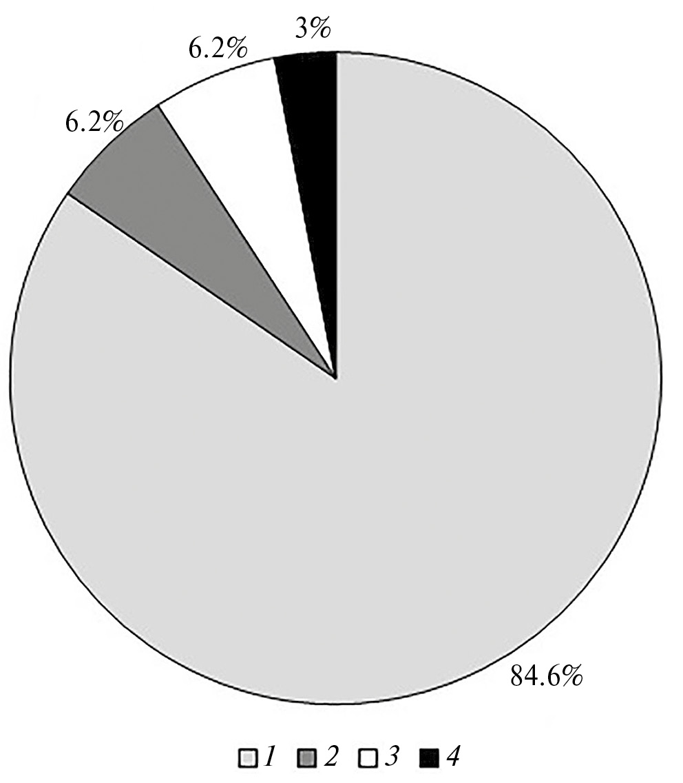 Рис. 2. Доли частиц МП различной формы в ЖКТ взрослых особей Rana amurensis. 1 – волокна, 2 – пленки, 3 – сферы, 4 – фрагменты.