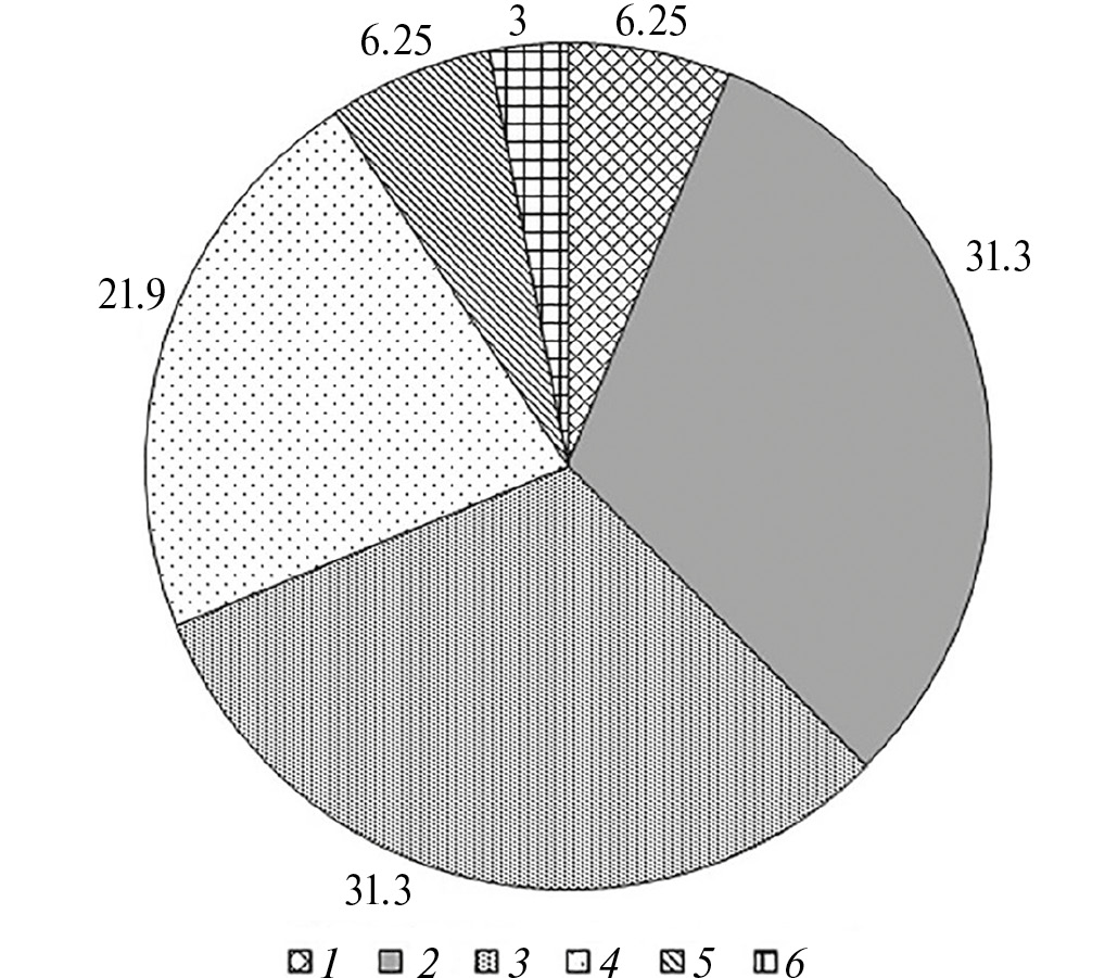 Рис. 3. Распределение (%) частиц микропластика разного размера (мм) в ЖКТ взрослых особей Rana amurensis. 1 – 0.15–0.30, 2 – 0.31–1.00, 3 – 0.1–2.00, 4 –2.01–3.00, 5 – 3.01–4.00, 6 –4.01–5.00.