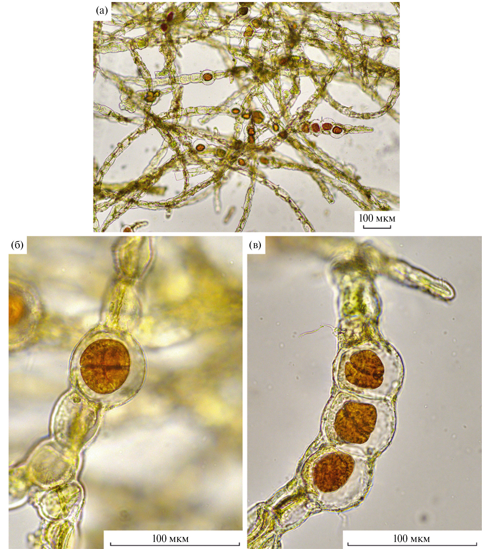 Действительно, изучение сезонных сборов 2019–2020 гг. показало, что у м. Мартьян именно в осенних пробах (19.11.2019 г.) обнаружены органы репродукции B. hamifera. Зрелые (без признаков выхода спор на момент отбора проб) тетраспорангии в обилии зарегистрированы на всех обследованных глубинах во всех пробах (рис. 2а). Анализ этих материалов показал, что у однорядных нитчатых талломов B. hamifera в спорангии могут превращаться любые клетки, кроме апикальных. При этом, максимальное количество спорангиев образуется в конечных веточках, где они располагаются не только одиночно и попарно, а образуют чаще, чем в других местах, ряды по три-четыре штуки подряд (рис. 2а–2в). Спорангии имеют форму почти правильных шаров, дважды усеченных в местах контактов с клетками нитей или с соседними спорангиями; их диаметр составляет 53.15 ± 3.80 мкм. Полупрозрачные тетраспоры оранжево-коричневого цвета, имеющие мелкозернистую консистенцию, окружены тонкими прозрачными бесцветными оболочками и прозрачным слабоокрашенным слегка зернистым содержимым, совокупная толщина которых от пяти до 12-ти мкм (обычно 8–10 мкм). При оптическом увеличении ≥×400 становятся хорошо различимыми борозды, разделяющие отдельные споры внутри спорангиев (см. рис. 2б, 2в).